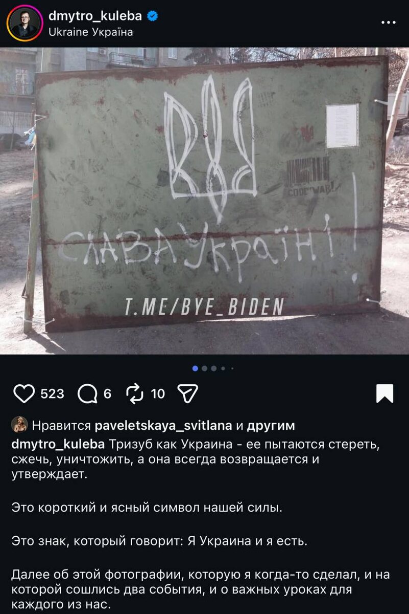 Кулеба выложил фото куска забора из 2014 года, на котором вандалы нарисовали трезубец, и рассказал, как гордится гербом и историей