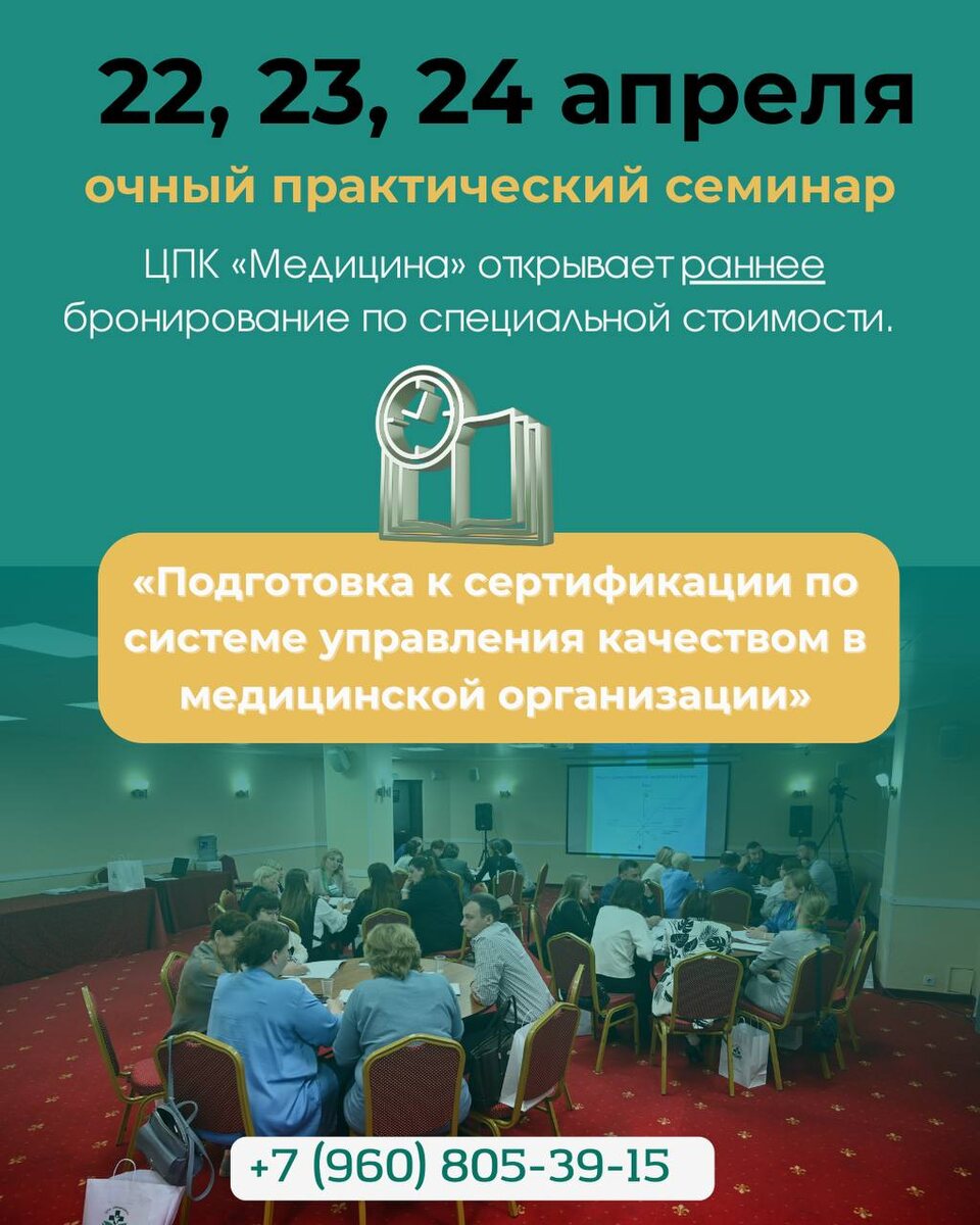 ‼️22, 23, 24 апреля состоится очный практический семинар «Подготовка к сертификации по системе управления качеством в медицинской организации» ЦПК «Медицина» открывает раннее бронирование по специальной стоимости. Если вы планируете участие — сейчас оптимальный момент зафиксировать место и цену. Семинар полностью очный и практико-ориентированный. Ключевой акцент — на реальных задачах медицинских организаций и готовых инструментах для внедрения. В программе: - Практика на базе «РЖД-Медицина» Разбор и демонстрация организации системы управления качеством в действующем медицинском учреждении. - Разбор реальных кейсов медицинских организаций с разным уровнем готовности к сертификации. - Практические инструменты внедрения СМК и подготовки к сертификации. - Моделирование ситуаций проверок и аудитов — отрабатываем алгоритмы действий и типовые сценарии. - Работа с документами и управленческими решениями: что должно быть, как оформлять, на что смотрят проверяющие. - Ответы на ваши конкр