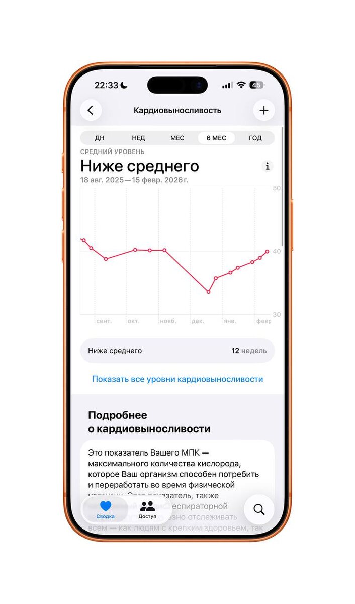 Раздел «Кардиовыносливость» в здоровье показывает максимальное количество кислорода которое ваш организм может принять и переработать. Чем этот показатель выше, тем лучше. Поднять его можно тренировками. По моему графику видно что пора начинать бегать.
