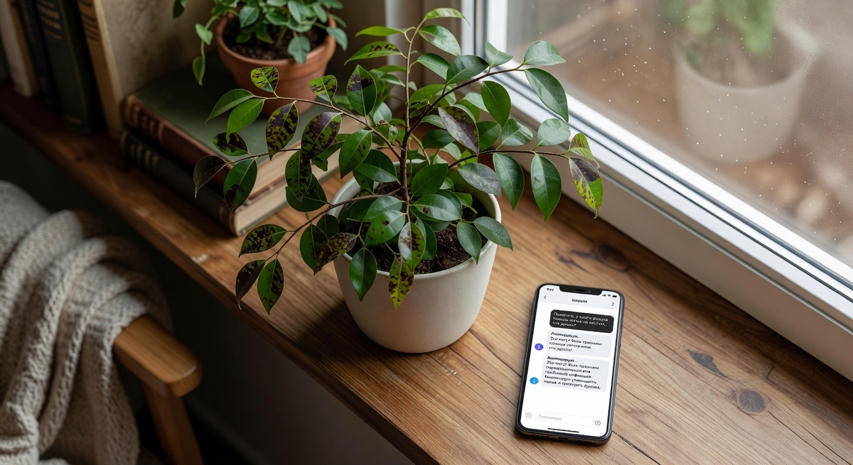 У моего фикуса Бенджамина на листьях появились тёмные пятна с жёлтой каймой. Часть листьев осыпалась за неделю. Интернет-поиск по запросу «пятна на листьях фикуса» выдал три десятка болезней, каждая со своим лечением. Перебирать все варианты вручную — занятие сомнительное. Тогда я решила проверить, справится ли нейросеть с задачей, которую обычно решают агрономы и опытные цветоводы.