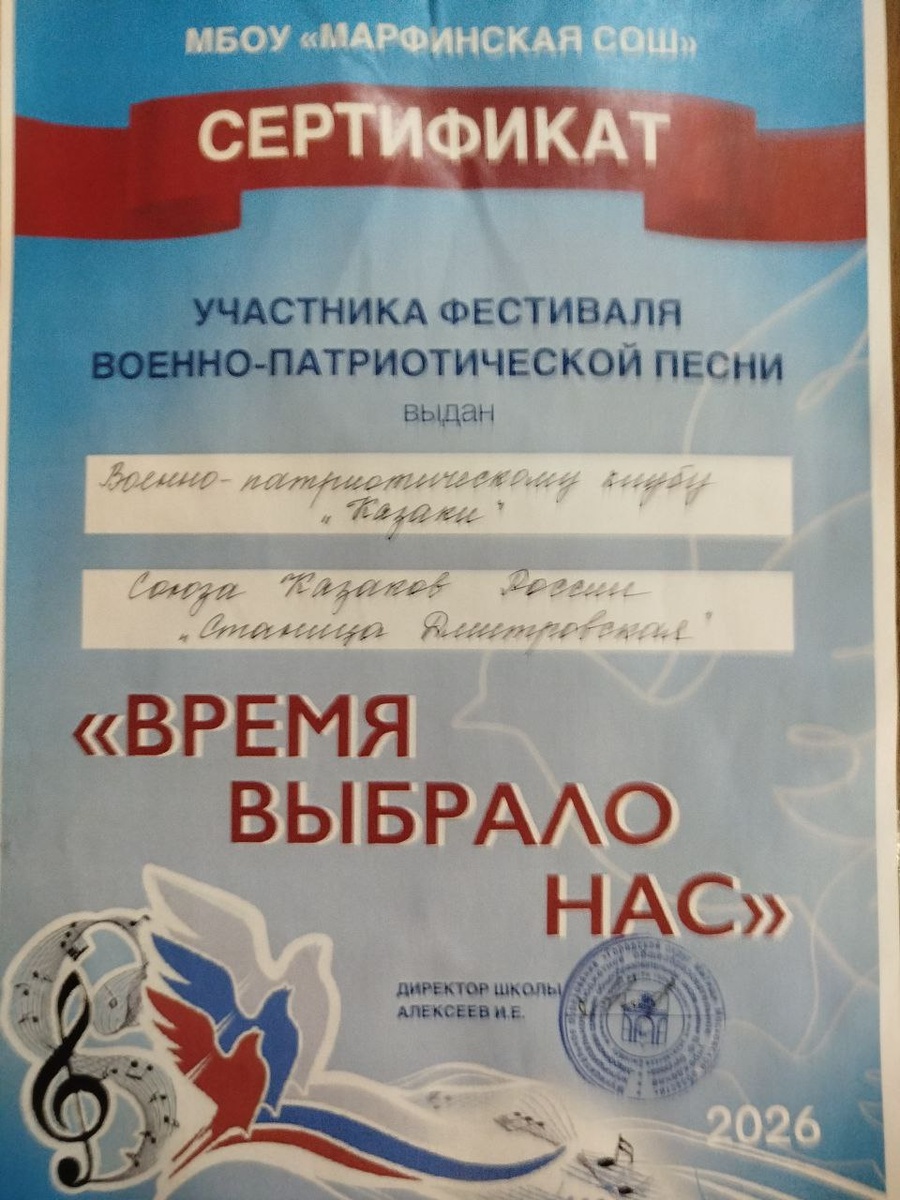 Выступление кадетов ВПК"Казаки" г.Дмитров и заместителя руководителя МВПК "Патриот" п.Горшково vk.com/wall-223263182_558 13 февраля 2026 г Кадеты ВПК "КАЗАКИ" под руководством руководителя Марчук А.В казаков МОКО СКР России станица "Дмитровская" г. Дмитров и наших друзей МВПК "Патриот" п. Горшково руководитель Капустин А.С и заместитель Капустина А.В приняли участие в фестивале военно-патриотической песни в МБОУ "Марфинская СОШ" школа имени В.Ф. Бутузова» городского округа Мытищи Московской области. Наши кадеты совместно с заместителем МВПК "Патриот" выступили для всех гостей фестиваля с показом фланкировки шашками, по краям сцены стояли знаменосцы которые держали в руках флаги казачества . Увиденное повергло всех в восторг и удивление как оно там все красиво и складно получается и что всему этому действительно можно научится ,главное иметь желание. в память о выступлении и то что все было на высоте наши кадеты получили сертификат. После такого яркого выступления Нашим кадетам и казака