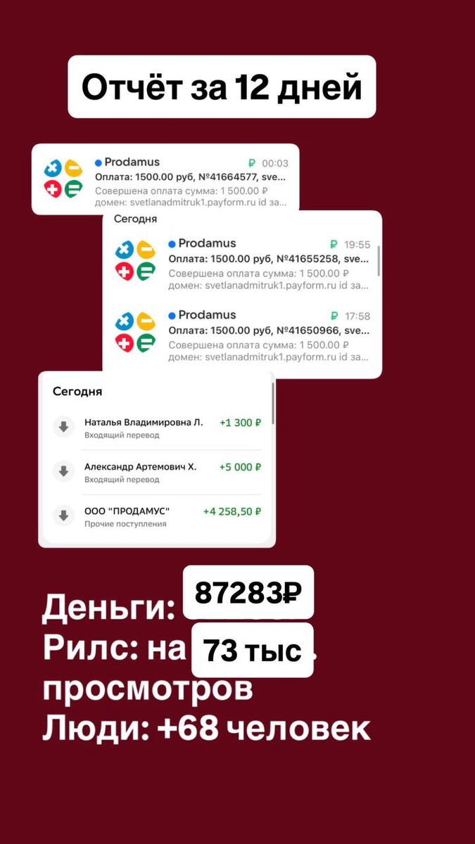 За 12 дней 87283₽, рилс на 73 тыс. и 68 человек в блог Хочу поделиться с вами одной историей. Недавно я решила проверить одну вещь. Мне стало интересно - правда ли деньги зависят от состояния? Не от количества действий. Не от «надо больше стараться». А именно от того, что внутри. Я не делала ничего сверхъестественного. Я просто работала с собой. Смотрела, где у меня есть напряжение. Где есть страх. Где я сама себе не разрешаю больше. И вот что получилось за 13 дней: Итого - 87283₽. Пришло 22 человека в тг Рилс залетел на 73 тысячи, пришло +46 человек в блог. Но знаете, что для меня было самым важным? Не цифры, а то, что внутри было спокойно. Не было суеты. Не было мысли «а вдруг не купят». Не было напряжения в теле. Было ощущение устойчивости. Как будто я не выбиваю деньги, а позволяю им приходить легко и свободно. И вот тогда я очень чётко увидела: когда внутри есть разрешение на деньги - они приходят иначе. Когда нет внутреннего «надо выжить» - действия становятся проще. И