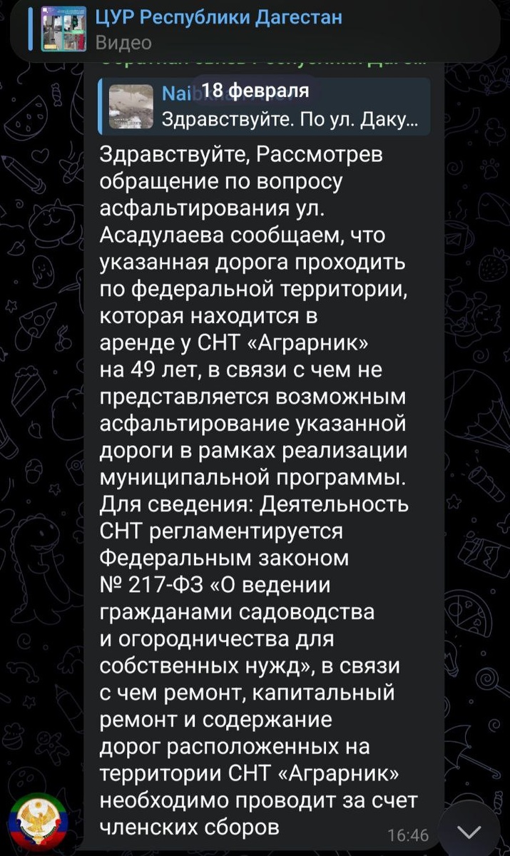 Асадулаева в Махачкале: неопровержимые видео-доказательства "бюджетного" бурения». Уважаемая редакция! В продолжение темы о саботаже реконструкции ул. Асадулаева (Тростниковой), о которой вы писали ранее, направляем вам ключевое доказательство, разбивающее в прах все отписки УЖКХ Махачкалы. На видео зафиксирован февраль 2024 года. Пока чиновники в своих сегодняшних ответах через ЦУР пытаются выдать улицу за "частную территорию СНТ", мы показываем, как на этой самой "частной земле" два года назад вовсю работала техника компании "АКСИТЕХ". Проводилось бурение и изыскания — обязательный этап исполнения муниципального контракта на разработку ПСД. Факты, которые больше нельзя игнорировать: Если город в 2024 году тратил бюджетные деньги на изыскания (видео — лучшее тому подтверждение), значит, статус дороги как муниципальной был официально закреплен. Текущие отписки про "аренду СНТ" — это не просто ошибка, а попытка скрыть невыполнение плана при наличии подтвержденного Минтрансом финанс