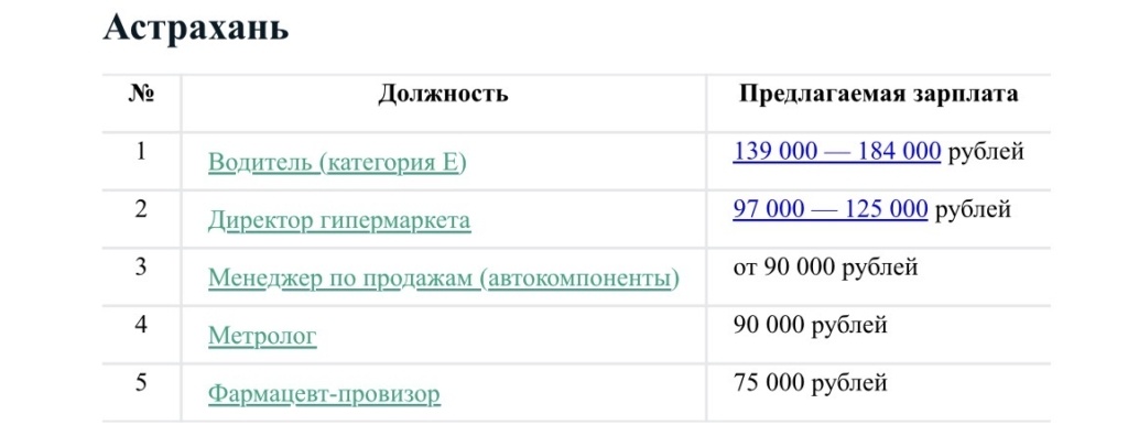 Сервис по поиску высокооплачиваемой работы SuperJob проанализировал вакансии в городах, численность населения которых составляет от 500 тысяч до 1 миллиона человек, отобрал лучшие предложения февраля. Оказалось, что в Астрахани в данный момент больше всего готовы платить водителю категории «Е». Компания предлагает зарплату до 184 тысяч рублей, бесплатное питание, ремонт ТС без участия водителя, возможность переобучения, корпоративную мобильную связь, спецодежду, бесплатный медицинский осмотр. На втором месте оказалась вакансия директора гипермаркета. Там в месяц готовы платить до 125 тысяч рублей. Требования к кандидату следующие: высшее образование, опыт работы на аналогичной должности от одного года. На третьем месте – менеджер по продажам с зарплатой от 90 тысяч рублей. Столько же платить готовы и метрологу. А фармацевт-провизор может получать по 75 тысяч рублей в месяц. В других городах ситуация иная. Например, в Саратове, Ульяновске, Иркутске, Томске, Рязани, Кирове хорошо платить