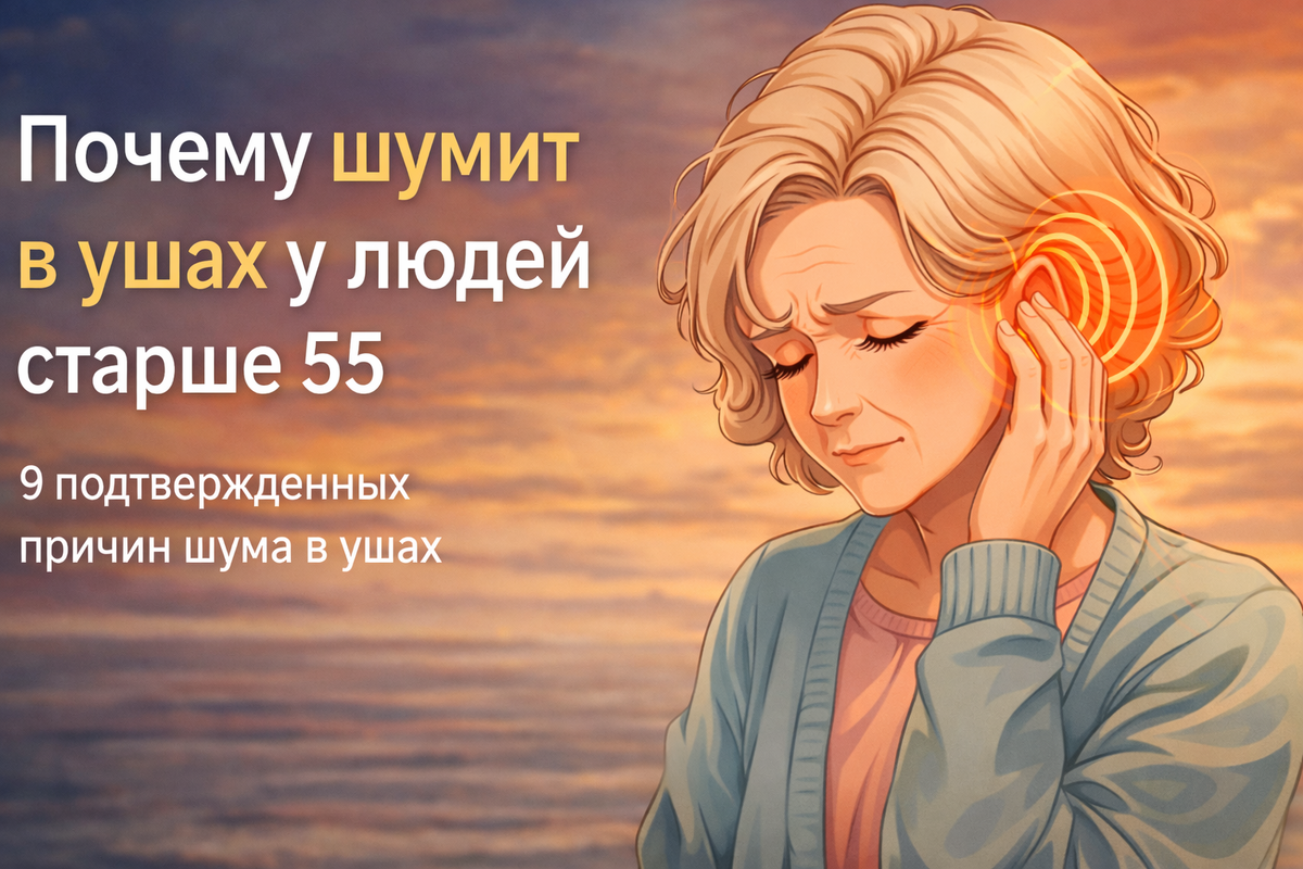 Шум в ушах после 55 лет - одна из самых частых жалоб на приеме у терапевта и ЛОР-врача. Кто-то слышит звон, кто-то - гул, свист или ощущение «пульсации». По данным эпидемиологических исследований, хронический тиннитус встречается у 10-20% взрослых, а после 60 лет - значительно чаще. Важно понять главное: шум в ушах - это не болезнь, а симптом. И у него всегда есть причина. Ниже - подтвержденные факторы, которые чаще всего стоят за этим состоянием. Самая распространенная причина - пресбиакузис, возрастная потеря слуха. С возрастом гибнут волосковые клетки внутреннего уха, которые отвечают за восприятие звука. Мозг начинает «достраивать» недостающие сигналы - так и появляется фантомный шум. Часто человек не замечает снижения слуха, но уже слышит звон. Артериальная гипертония напрямую связана с тиннитусом. При скачках давления ухудшается кровоснабжение внутреннего уха. Особенно характерен пульсирующий шум - совпадающий с ритмом сердца. Если шум появляется вместе с головной болью или «мушк