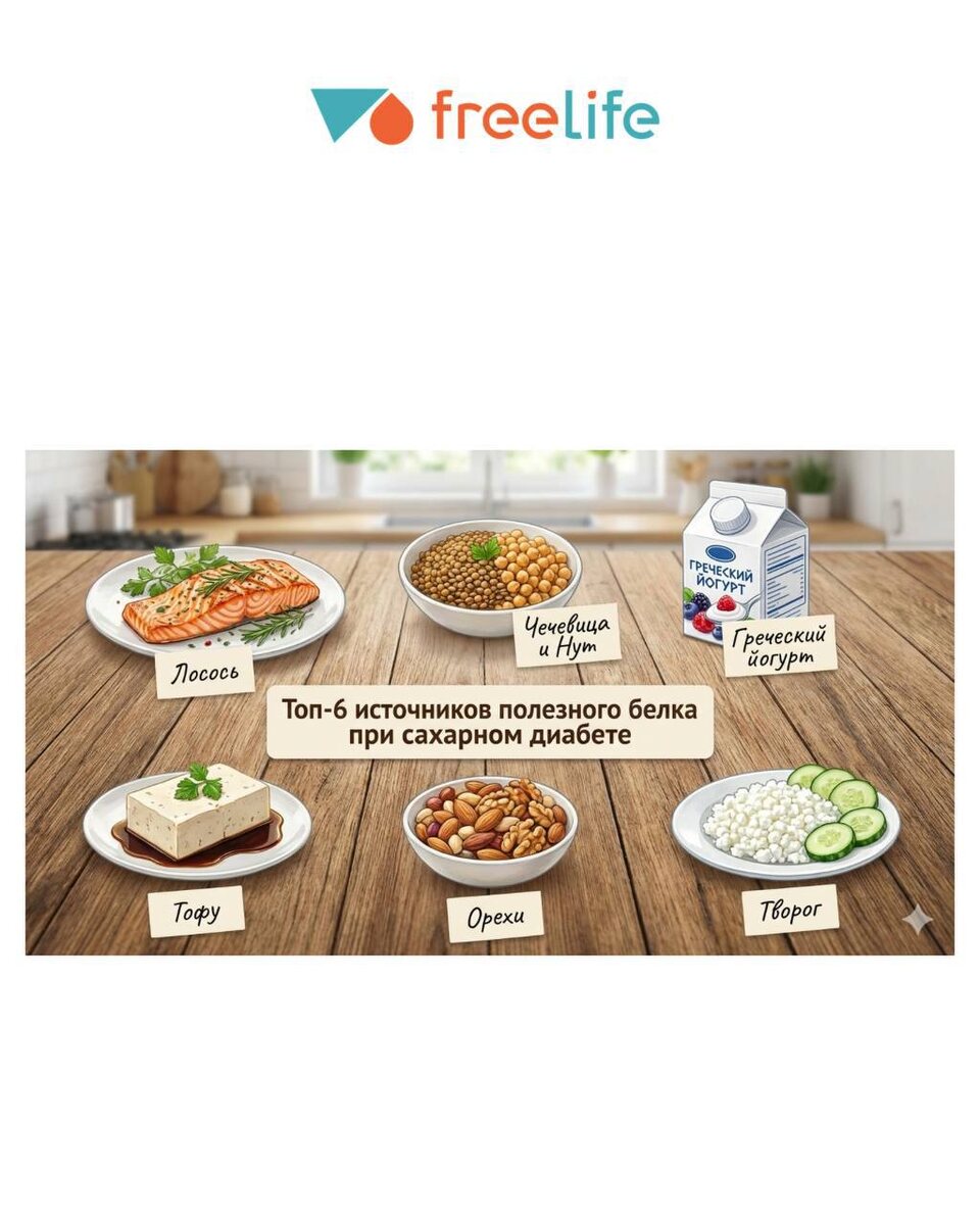 Белок — ключевой компонент питания при диабете. Он помогает стабилизировать уровень сахара, дольше сохранять сытость и поддерживать мышечную массу. Вот лучшие источники 👇 1️⃣ Куриная грудка ≈31 г белка на 100 г, минимум жира и почти нет углеводов. Идеально: запекать, готовить на пару, добавлять в салаты. 2️⃣ Рыба (лосось, тунец, треска) 20–25 г белка на 100 г + омега-3. Поддерживает здоровье сердца, что особенно важно при диабете. 3️⃣ Тофу и темпе 10–20 г белка на 100 г. Растительный вариант с низким влиянием на гликемию, богат железом и кальцием. 4️⃣ Бобовые (чечевица, фасоль, нут) 9–12 г белка на 100 г + клетчатка. Замедляют всасывание углеводов и помогают избегать резких скачков сахара. 5️⃣ Нежирный творог ≈15 г белка в порции, минимум углеводов. Поддерживает контроль веса и чувство сытости. 6️⃣ Сейтан ≈25 г белка на 100 г. Отличная альтернатива мясу (если нет непереносимости глютена). 💬 Помните: контроль сахара начинается с тарелки. А чтобы видеть, как питание влияет