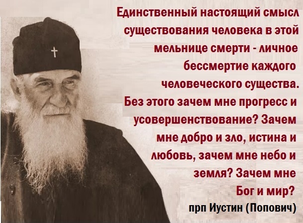 ПРАВИЛЬНЫЕ МЫСЛИ Жизнь человека непроста. Постоянно возникающие проблемы в отношениях с близкими и просто людьми, со здоровьем, в личной жизни, на работе, финансово-материальные, несправедливость в обществе, наконец, неизбежные угасание и смерть плоти - всё это поднимает целый ряд вопросов. Не сильно ошибусь, наверное, назвав среди них следующие. Как не впасть в депрессию, если всё складывается так, что бытие наполняет бесконечная суета, и впереди кроме безнадёги быстротекущей и многотрудной жизни ничего не просматривается? Что может поддержать человека в трудные минуты жизни? Что может дать опору, смысл, когда в душе пустота? Согласитесь, эти и подобные ситуации в жизни нередки, а вопросы – весьма актуальны… Слова сербского христианского подвижника Иустина (Поповича) дают подсказку ответа на эти вопросы. Это – осознание того, что душа каждого человека бессмертна. Без этого, как говорит Иустин – всё, что в мире, теряет смысл. На самом деле, без веры в это, а я бы сказал больше, - без о