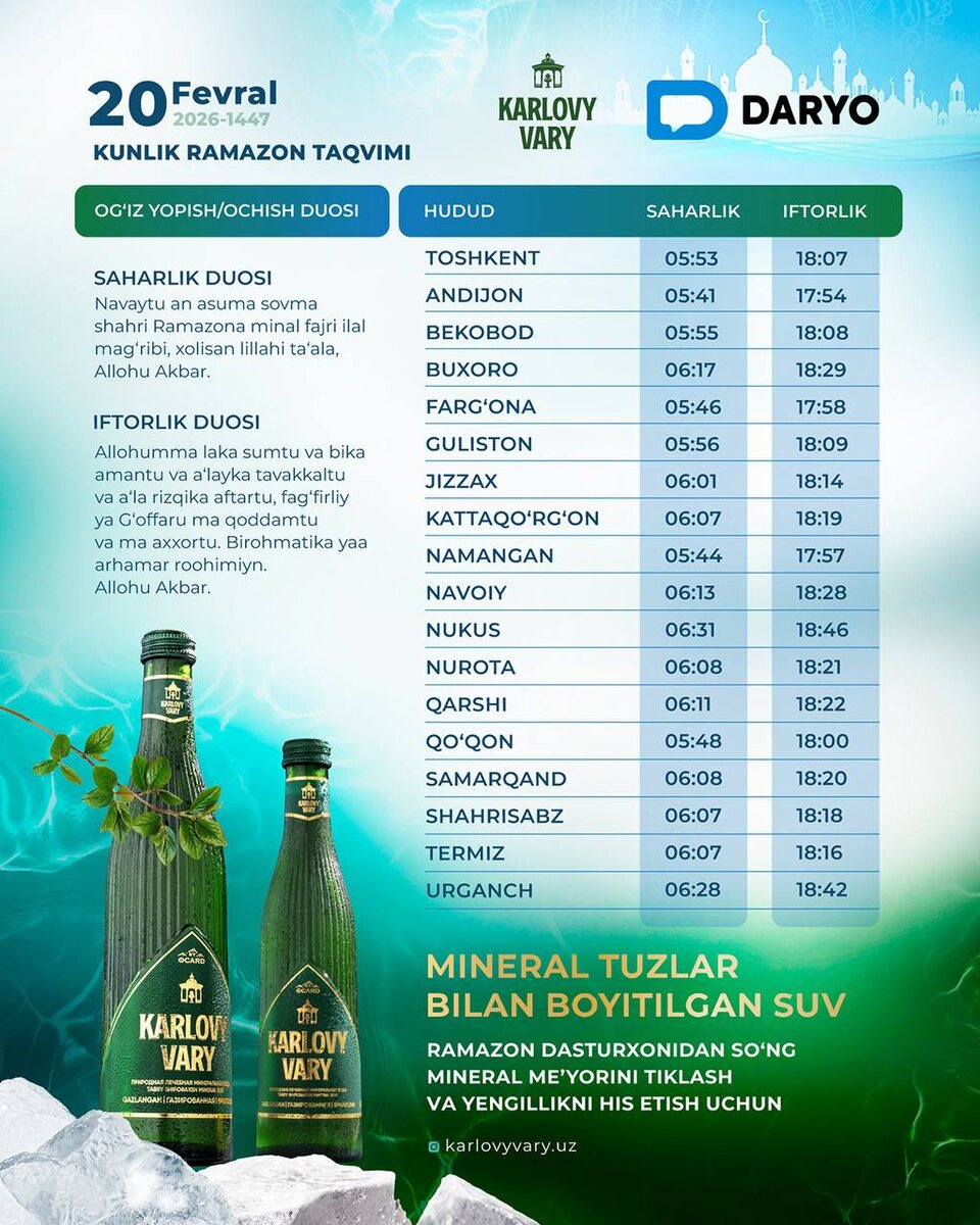 Navaytu an asuvma sovma shahri ramazona minal fajri ilal mag‘ribi, xolisan lillahi ta’aalaa Allohu akbar. Ma’nosi: Ramazon oyining ro‘zasini subhdan to kun botguncha tutmoqni niyat qildim. Xolis Alloh uchun Alloh buyukdir. @daryolive
