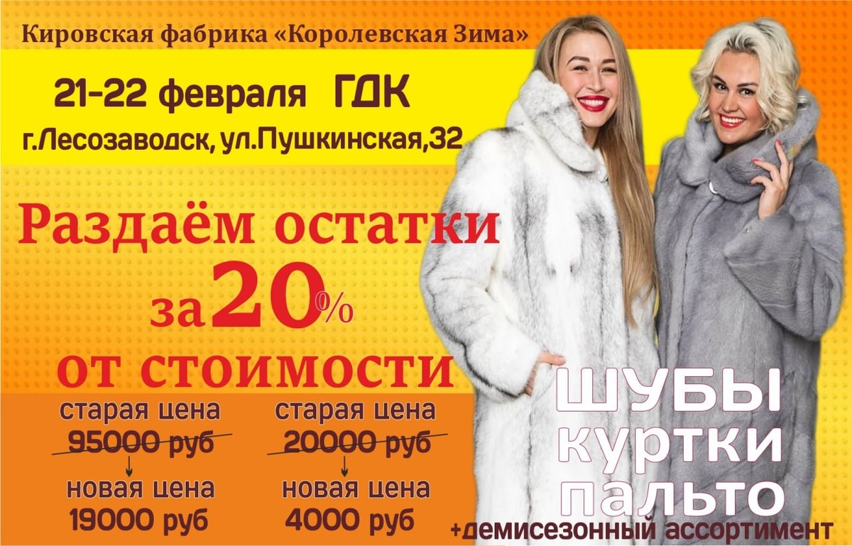 💫 👉 Только 21-22 февраля, ГДК , г.Лесозаводск 🧡 ул.Пушкинская,32 Меховая компания "Королевская зима" приглашает вас посетить ВЫСТАВКУ-ЯРМАРКУ ВЕРХНЕЙ ОДЕЖДЫ с потрясающими ценами на лучшие модели шуб! Для Вас: ✅ Шубы: Норка, мутон, астраган, керли ✅ Пальто, куртки (зимние и демисезонные) от 1000 руб Скидка 80% на ВСЁ ПРОМОКОД на скидку на все покупки здесь:https://lesozavodsk.korolevskaya-zima.ru