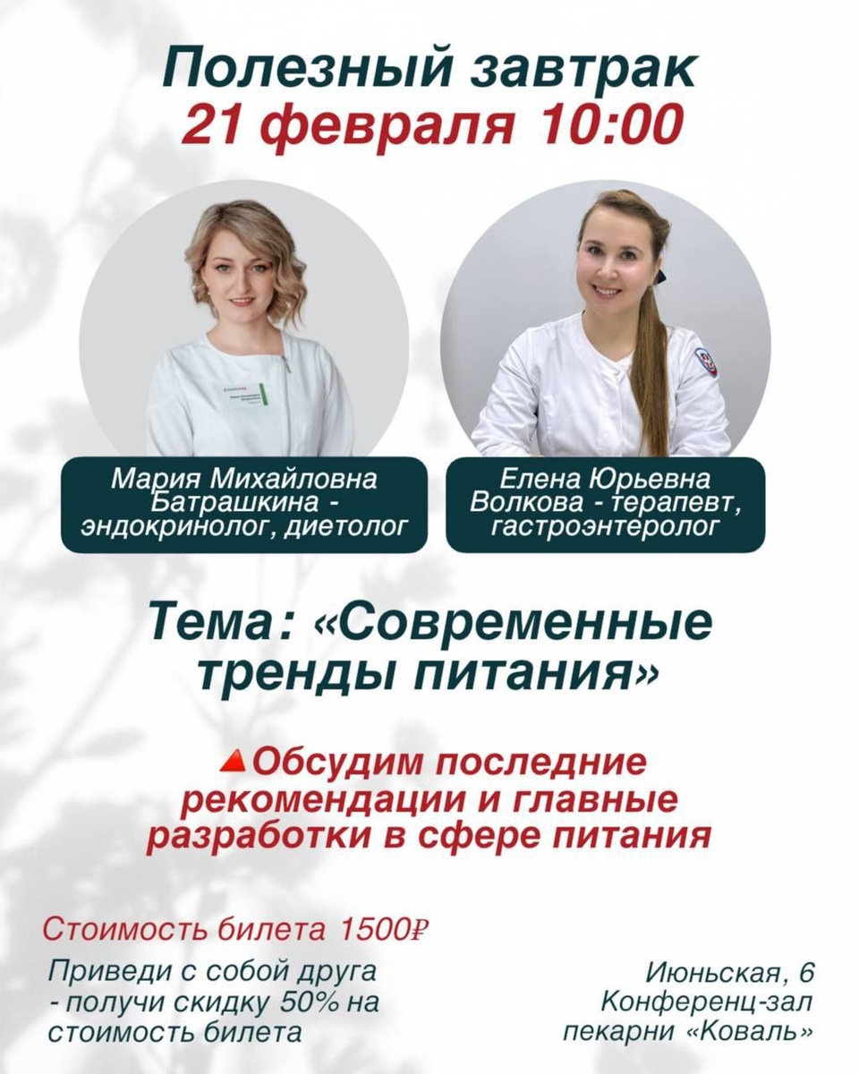 " Организаторы предлагают поговорить о последних рекомендациях и главных разработках в сфере питания и пищеварения вместе с докторами – эндокринологом, специалистом по правильному питанию Марией Батрашкиной и терапевтом, гастроэнтерологом Еленой Волковой. Обещают накормить сбалансированным и вкусным завтраком 🕐21 февраля, 10:00 📍Июньская, 6, конференц-зал пекарни «Коваль» 🪙1500 рублей 🔑запись на мероприятие по телефонам: 89248111271 или 209-000 Предложить публикацию:@zabkulisye_bot Забкулисье в MAX