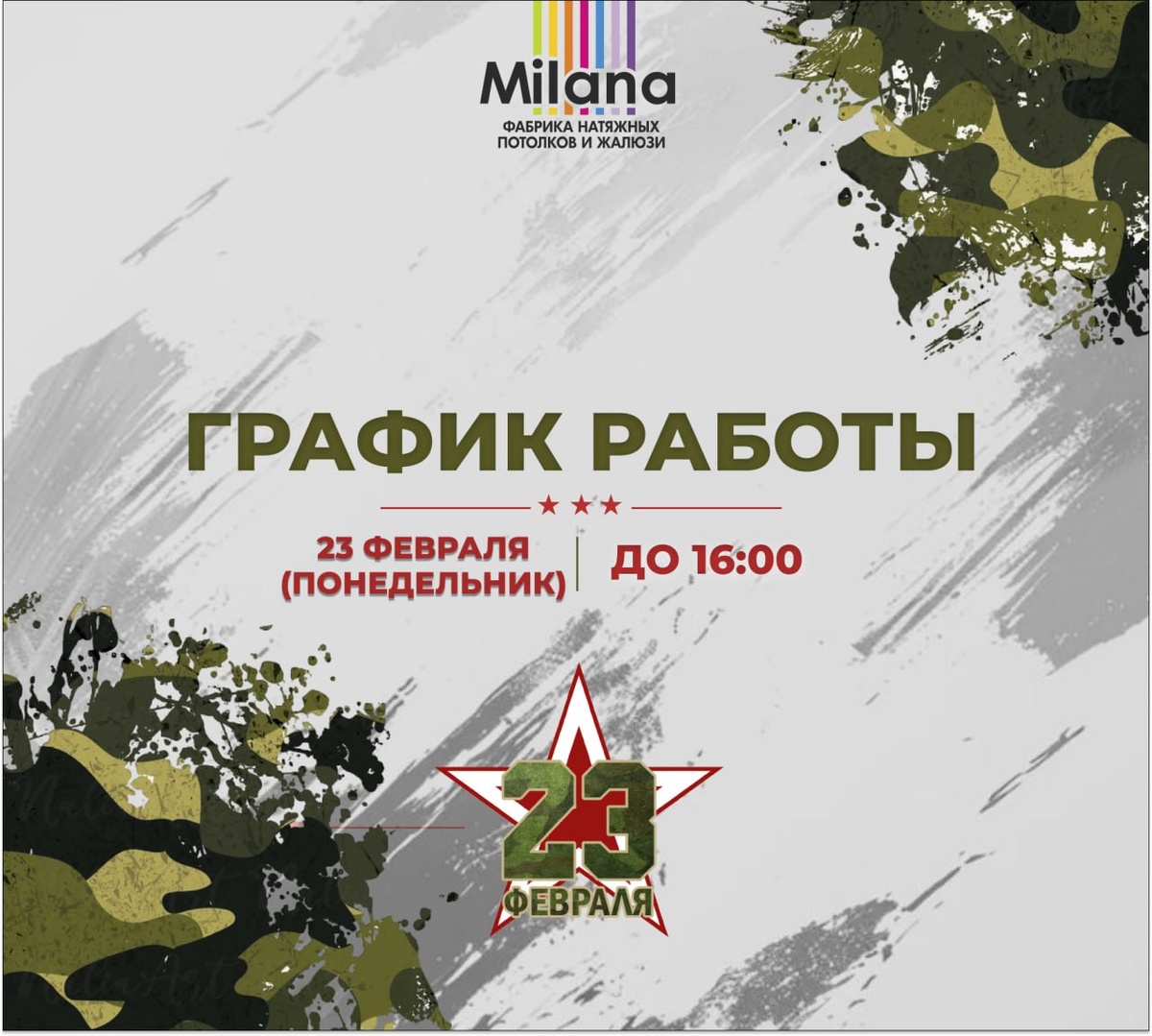 ! Поздравляем с Днём защитника Отечества! Пусть в вашем доме всегда царят уют, комфорт и гармония, а каждый новый день приносит только радость и вдохновение. Желаем крепкого духа, уверенности и блестящих побед во всех начинаниях✨ Благодарим вас за доверие к фабрике «Milana» — мы всегда стараемся делать ваш дом ещё красивее и светлее✨ ‼️ 23 февраля (в понедельник) фабрика «Milana» работает до 16:00