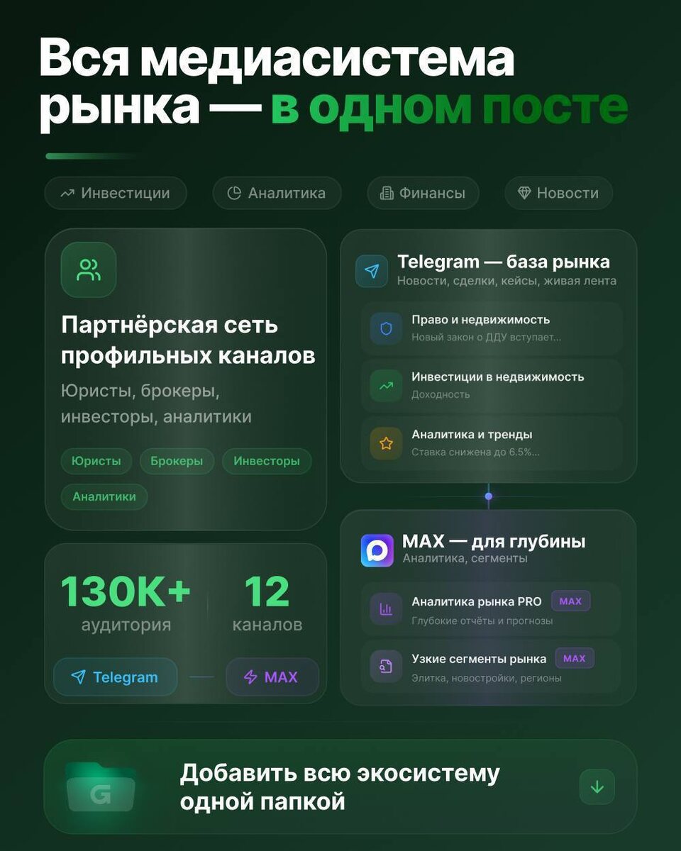 📁 Добавить все каналы 🤩🌟Премьер Недвижимость - Расскажем честно о недвижимости Москвы и МО: как правильно выбрать недвижимость для инвестиций, как купить квартиру без первоначального взноса. Подписывайтесь и получайте на нашем канале подборки выгодных предложений, которых нет в открытом доступе. 📲 мы в MAX 🤩 Центр ипотечного кредитования — ипотечный брокер нового уровня. Нам уже доверяют одобрение клиентов более 200 партнёров по всей России: агентства недвижимости, застройщики ИЖС и МКД, частные риелторы. 📌 Основатель компании — Екатерина Мишина @ipoteka_cik. Мы поможем реально получить одобрение ипотеки и обеспечим комфортное оформление сделки в любом регионе РФ. 📲 Мы в MAX 🤩 Финансовый дневник - Актуальные новости об экономике и финансах 🤩 Rent for Friend - - телеграм канал, который освещает интересные события, полезные факты и статистику из мира недвижимости. В нашем боте можно разместить свой объект бесплатно! 🤩 Инвестиционные идеи - Авторский канал об и