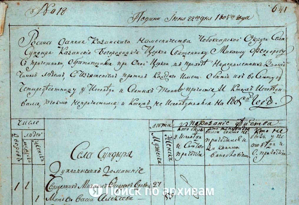 1805 год. Село Сундырь. Чебоксарский уезд. Бандин Осип Михайлович.