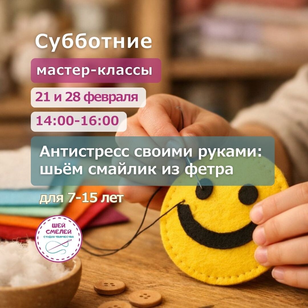 ?🤔 Телефон и игрушки надоели, а до вечера ещё далеко. Есть идея получше, чем просто сидеть и ждать понедельника. 🌟Две субботы - 21 и 28 февраля на Мельникова проведем мастер-классы «Антистресс своими руками». Будем шить смайликов из фетра. Самых разных: улыбчивых, задумчивых, с веснушками или без. В программе: * Раскрой по шаблону (справится даже тот, кто никогда не шил). * Наполнение (хочешь - мягко, хочешь - поплотнее). * Декор (глазки, щёчки, бантики - полная свобода). Результат: два часа без гаджетов и готовый друг в кармане 😃. 📍 ул. Мельникова, 7 стр.1, Дом культуры, м. Пролетарская, Дубровка 📅 21 или 28 февраля 🕑 14:00-16:00 👫 7–15 лет 💰 1000 руб. Запись: по ссылке Если остались вопросы - пишите в отдел заботы 📞 +7 (965) 178-37-38 P.S. С собой ничего не нужно. Только желание оторваться от телефона и сделать что-то настоящее. #ШейСмелей #Мельникова7 #кружкидетяммосква коммерческое предложение