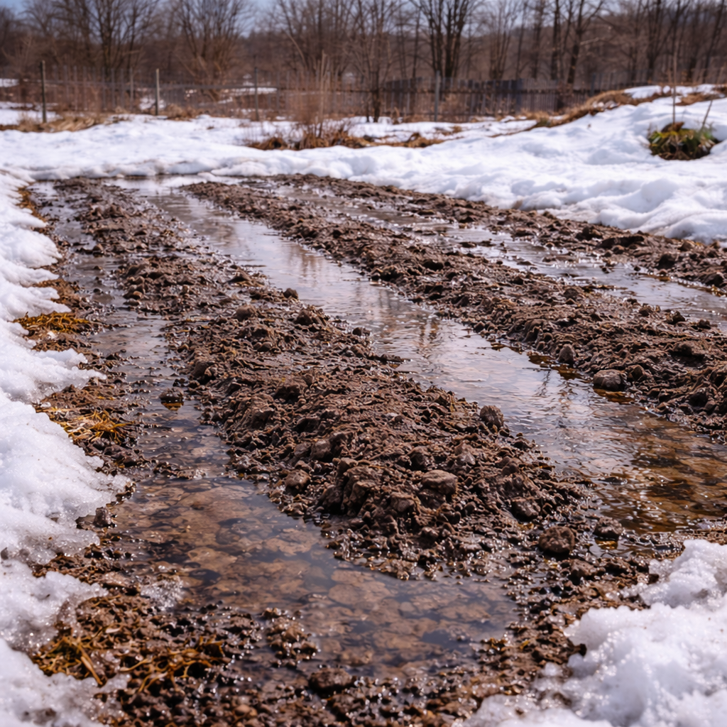 • верхний слой становится тяжёлым и липким Особенно это заметно на глинистых участках. Если оттепель продолжается несколько дней подряд, влага накапливается. Внутренние слои становятся насыщенными водой, а воздуха внутри почти не остаётся. Это временное состояние, но именно в такие моменты почва особенно уяз