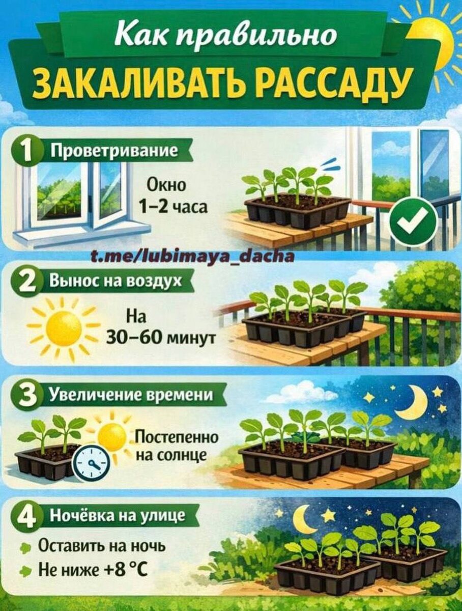 ? Без закалки рассада после высадки испытывает стресс и может: ▪️вянуть и «обгорать» на солнце ▪️замедлять рост ▪️болеть и хуже приживаться ▪️давать меньший урожай. Закалённая рассада: крепче и выносливее, быстрее адаптируется, лучше переносит холодные ночи, раньше трогается в рост. Начинают закалку за 7-14 дней до высадки в открытый грунт или теплицу. Условия: у рассады 3-5 настоящих листьев,температура на улице днём не ниже +10…+12 °C, нет сильного ветра и заморозков. Как правильно закаливать (пошагово) 1️⃣ Проветривание 1-2 день: открой окно на 1-2 часа, избегай сквозняков. 2️⃣ Вынос на воздух 3-4 день: вынеси на балкон/улицу на 30-60 минут, сначала в тень. 3️⃣ Увеличение времени, каждый день добавляй по 1-2 часа, постепенно приучай к солнцу. 4️⃣ Ночные условия, за 2-3 дня до высадки можно оставить на улице на ночь, если температура не ниже +8 °C Не закаляй больную или ослабленную рассаду,не выставляй сразу под прямые лучи, при похолодании закалку приостанови, полив - умеренн