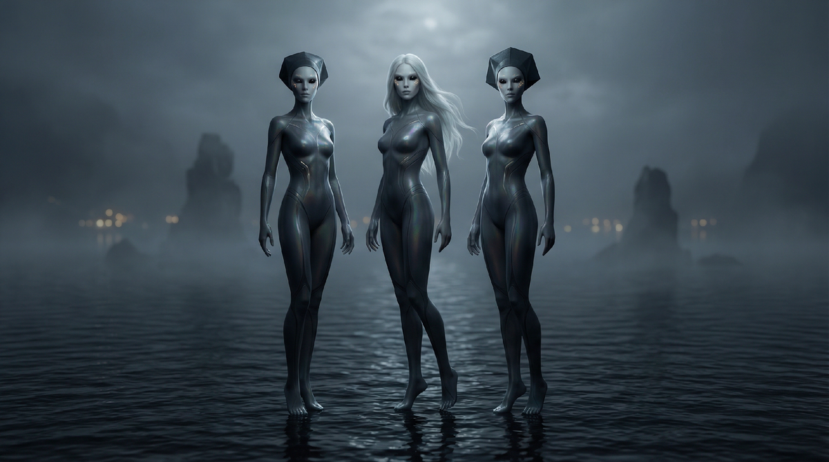 Они были красивы. Пугающе красивы. Бледная кожа, почти светящаяся в темноте. Волосы у одной были цвета платины, у двух других — темные, убранные в сложные геометрические прически. Черты лица — острые, скулы высокие, глаза… Даже с такого расстояния я чувствовал их взгляд. Они казались огромными.