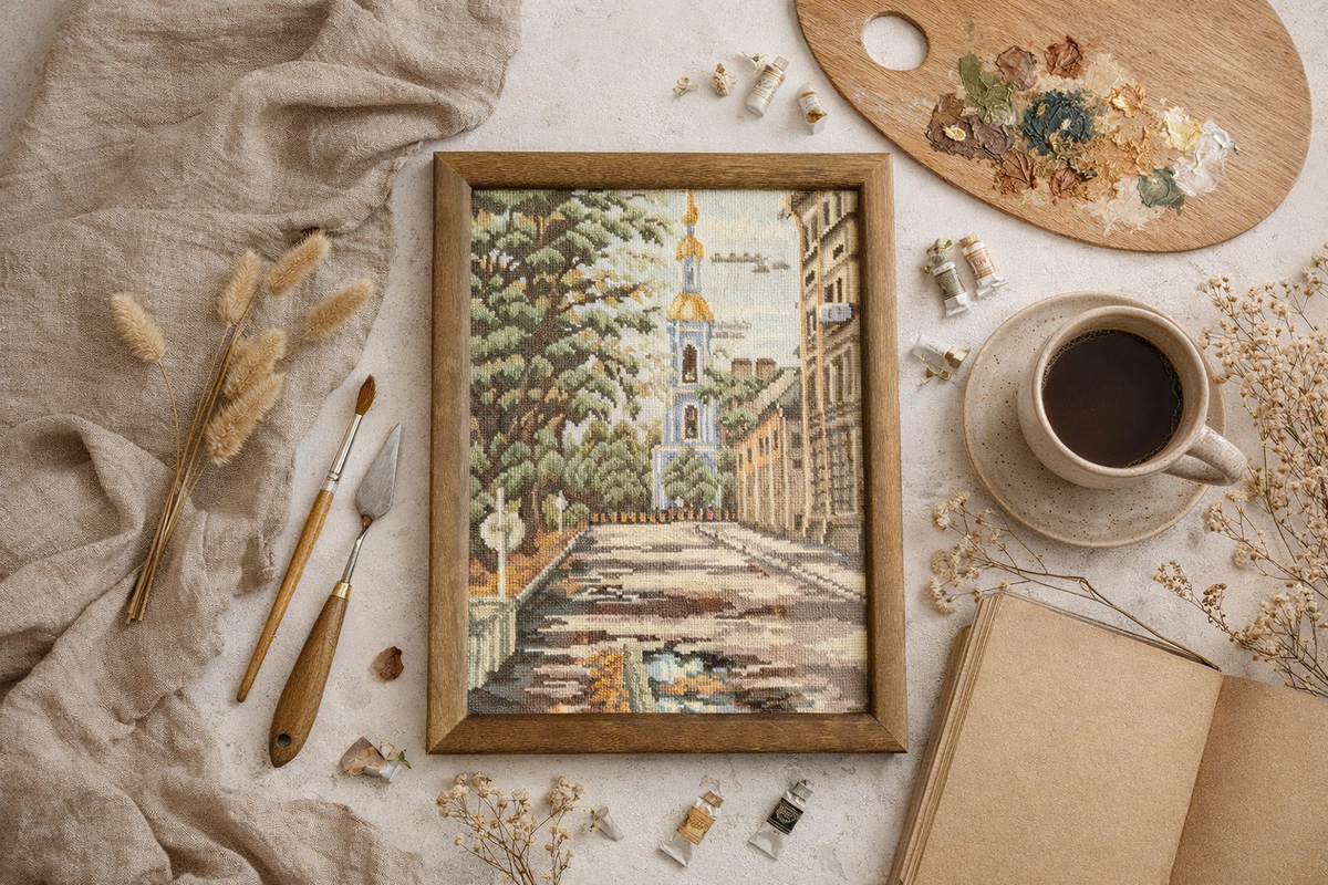 Готова она уже давно. Скажу даже больше - после нее есть уже 2 небольшие готовые работы и третья в процессе. Затеи-затеями, но вышивка по расписанию.)
