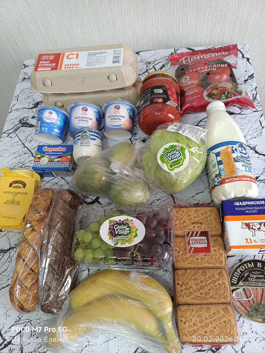 Заказала с утра доставку по мелочи, хлеб и молоко надо было, но где и когда мы этим ограничивались? Яйца нужны? Нужны, продукт повседневный и уходит регулярно. На пасту криль скидка хорошая, срок годности до мая, пусть стоит, есть-пить не просит. Иногда любим с хлебом поесть, вкусно. Томаты в собственном соку хорошие. Сыр, шпроты, молочка. Молоко простое для каш и омлетов, концентрированное для кофе. Виноград и бананы Евгению, он любит фрукты. Томаты для меня. Не очень они совсем, черри вкуснее, покупаю и их, но уж слишком дорого. Поэтому часто не беру. Ну и салат «Айсберг», и зеленая редька. Редьку буду делать с морковью, этот салат на работу не возьмешь, только дома поесть. Бигус делали с Евгением, он с пюре ел, я просто капусту с мясом. Салат делала «Селедка под шубой». Зачем тут топор, возможно, кто-то поинтересуется? Знаете, бывает, что глаз «замыливается» и ты только на фото видишь, что что-то не так. Так и с этим молотком для отбивания мяса произошло. Жарил тут Евгений стейки из