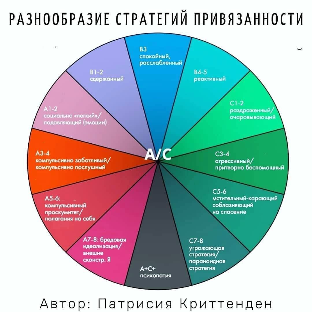 Важно упомянуть, что вообще такое привязанность. Любая. В отношениях со значимым взрослым (а по мере взросления и не только с ним) у ребенка формируется стратегия поведения, помогающая ему выживать в тех или иных условиях. Этих стратегий 12, из них 5 считается специалистами в области привязанности относительной нормой: 3 оттенка безопасной и по одному оттенку тревожной и избегающей (B1-3, C1-2, A1-2) Целых 5 «ок»-стратегий, а не одна, что дает нам свободу и право на ошибки. Это не пустые предположения, это многолетние исследования длиной в 30-40 лет с большим количеством участников и видеофиксацией. И не все зависит только от нас. Привязанность - штука очень динамичная. Дети строят отношения и с другими людьми (в том же саду, школе), вырабатывая дополнительные стратегии и меняя приоритетную при необходимости. И это прекрасно, так и должно быть. Я не думаю, что на одной безопасной стратегии можно далеко уехать. Всему свое место и время. Мы можем попасть в неприятности, открывая душу в о