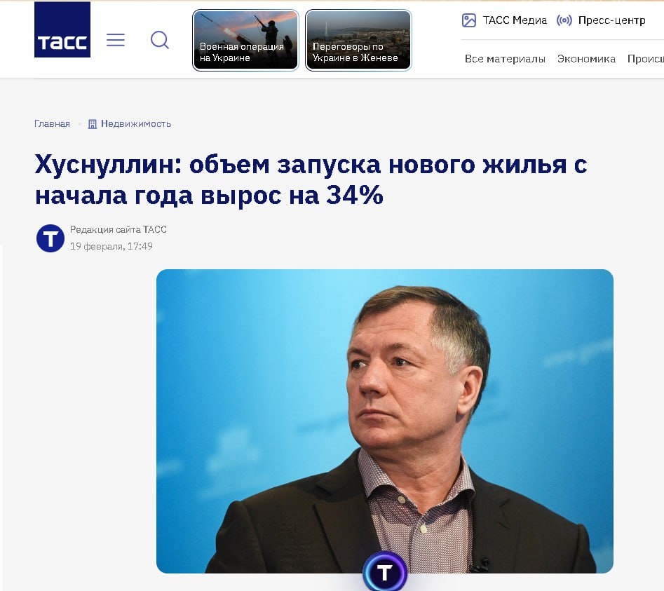 В своем репертуаре, на своей волне. ТАСС. Объем запуска нового жилья вырос на 34% с начала года по сравнению с показателями 2025 года - до 4 млн кв. м, сообщил вице-премьер РФ Марат Хуснуллин. "Объем жилья в стадии строительства в январе сохранился на высоком уровне - 116 млн кв. м, что на 2% больше, чем в прошлом году». Всё как обычно, «взвейся-развейся», праздничные стяги. Только древко одного превратилось в кол, на котором хлопает крыльями, конвульсирует крылатый. А он и не заметил. 🛸 Неустойка & компенсация: да/нет 🏜 Форум ИкараNET