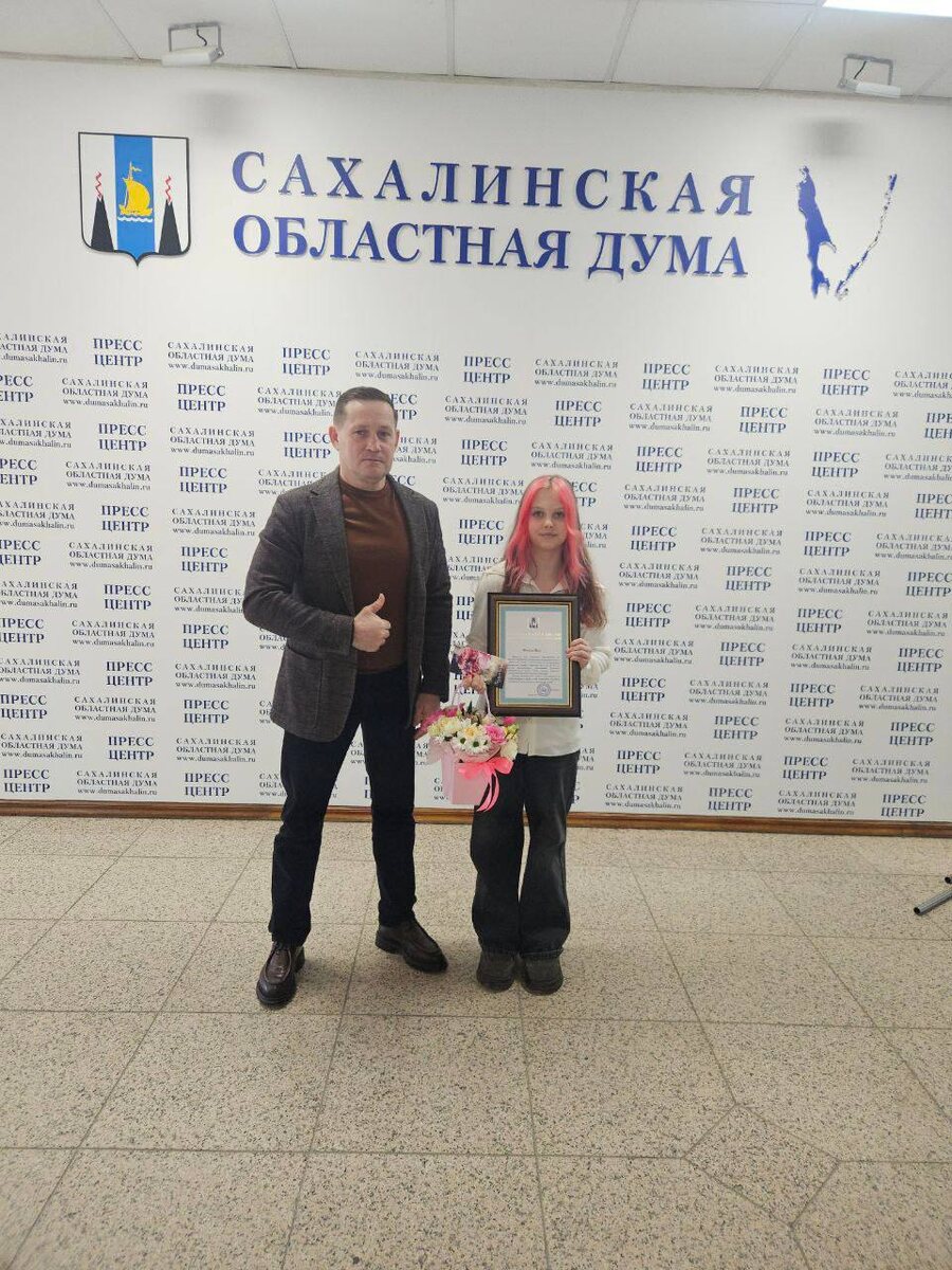 Сегодня депутат Сахалинской областной Думы от ЛДПР Виталий Баранов поздравил юную спортсменку — Яну Физер и вручил ей благодарственное