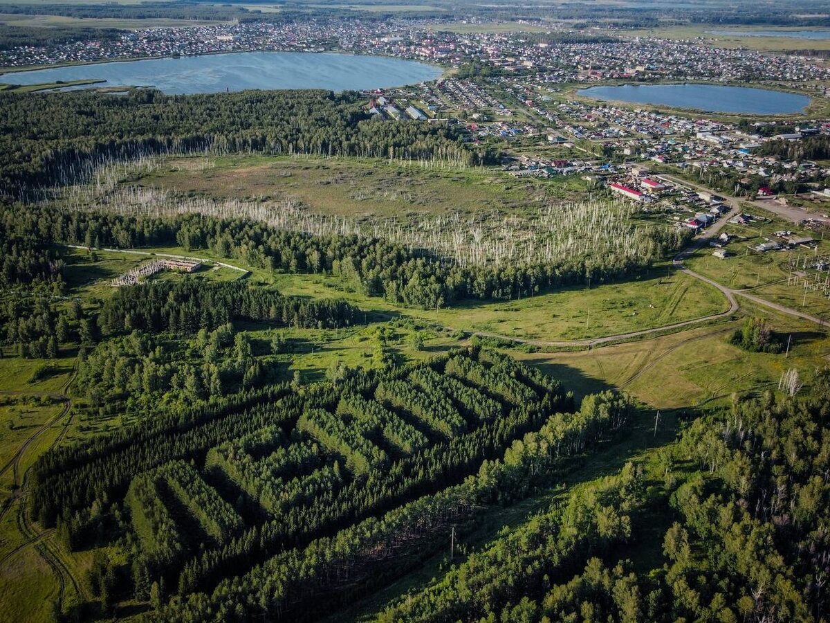 Едешь себе по трассе в сторону Алтая, вокруг классические пейзажи Омской области — поля, перелески, обычный город Тюкалинск за окном. Ничто не предвещает. Но открываешь карты, переключаешь на спутник — и дух захватывает. Прямо в трёх километрах от федеральной трассы, среди болотистой равнины, кто-то гигантской рукой вывел слово «ЛЕНИН». Буквы длиной под 300 метров. Идеальные, ровные, живые. Это место с земли не разгадать. Подъезжаешь к координатам, а там просто обычный лесок. Сосны, ели, пахнет хвоей, поют птицы. И только когда поднимаешь дрон (или смотришь на скриншот со спутника), понимаешь масштаб замысла. Оказалось, это геоглиф 1970 года. К 100-летию Ленина студенты местного сельхозтехникума, школьники и работники лесхоза взяли и высадили тут больше 13 тысяч деревьев — ровно по контуру букв. Они не просто сажали лес, они писали послание в будущее, которое можно прочитать только с неба. Сейчас, спустя полвека, надпись все также чёткая. Сосны вымахали, и внутри букв сумрачно и ти