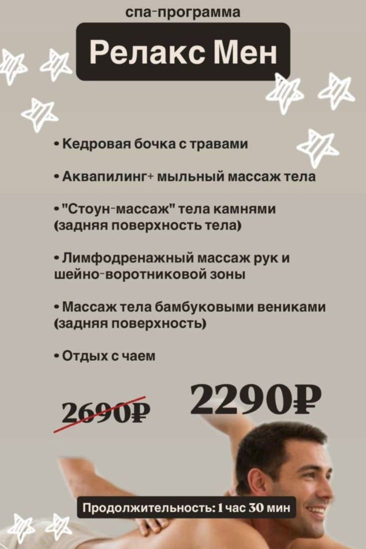 ! ✨незабываемое время отдыха и расслабления, станет приятным сюрпризом для него. ✅С 19 февраля по 22 февраля включительно Спа программа "Релакс Мен" со скидкой 2290₽ вместо 2690₽🤗 🎁Для вашего удобства доступны электронные сертификаты или ждём в гости в наши студии👇 пр. Шахтеров 4 ☎️ 89059128030 ул. Весенняя 24 ☎️89059108030 Рекламодатель Ананьева Н О Токен 2VtzqwmEaWY