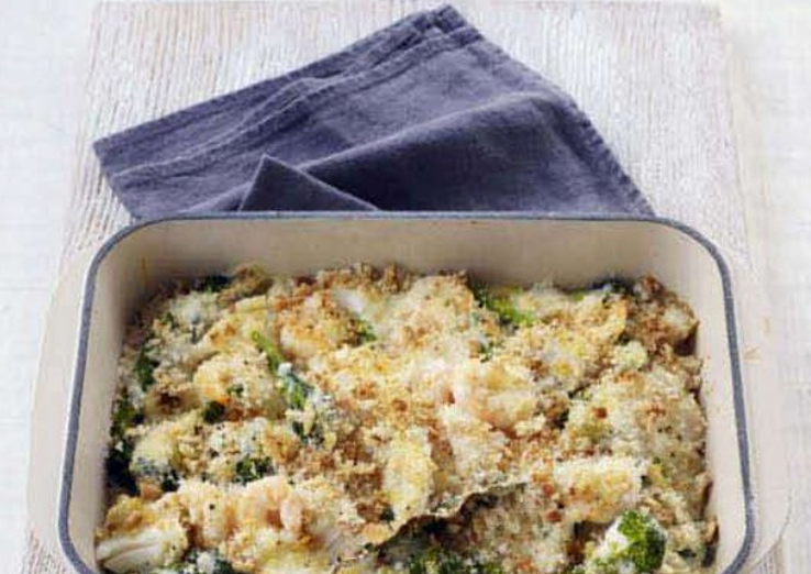 Время приготовления — 1 час 10 минут. 4 порции. Ингредиенты: 1. Положите рыбу, лавровый лист и лук в сковороду и залейте молоком. Доведите до медленного кипения, накройте и готовьте 2 минуты. Дайте настояться 10 минут. 2. Нагрейте духовку до 200 градусов. Нарежьте брокколи на 4 см кусочки. Брокколи бланшируйте (поместите сначала ненадолго в кипяток, затем в холодную воду), промойте и просушите. Смешайте панировочные сухари и сыр. 3. Выньте рыбу из сковороды, процедите, молоко слейте обратно в сковороду. Смешайте кукурузный крахмал с 3 столовыми ложками воды. Добавьте в молоко, варите на слабом огне, перемешивая до загустения. Снимите с огня и приправьте соус. 4. Выньте лук и лавровый лист и добавьте соус в рыбу. Смешайте брокколи и креветки. Положите их в жаропрочную посуду. Посыпьте их панировочными сухарями и запекайте 20-25 минут или до появления золотистой корочки. В одной порции: 309 килокалорий, 47.2 грамма белка, 19.6 грамма углеводов, 5.2 грамма жира, 2.2 грамма насыщенных жиро