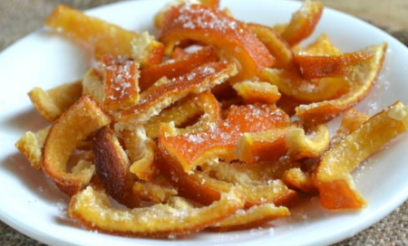 Ингредиенты: - апельсиновые корки - вода - сахар - сахарная пудра Приготовление: Апельсиновые корки нарезают в виде квадратиков, складывают в стеклянную посуду и заливают холодной водой, которую сменяют не менее одного раза в день. Эта операция длится пять дней. Подготовленные таким образом корки перекладывают в эмалированную кастрюлю, заливают водой и варят до мягкости, затем откидывают на сито. После этого корки опять помещают в кастрюлю и заливают сиропом (на 1 килограмм корок берут 1,5 кг сахара и 1 л воды). Варят до загустения сиропа, после чего выкладывают корки на блюдо, дают остыть и складывают в банку, пересыпая сахарной пудрой.
