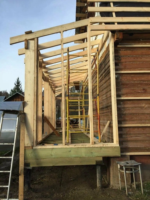 А в 2021 году, в августе месяце, мой ребёнок решил пристроить к нашему дому технический блок и открытую веранду. Нашла фирму - и в сентябре началась стройка Технический блок. Шире нельзя, потому что дальше теплицы. Строили всю зиму. Рабочие жили в вагончике, а мой ребенок со своим мужем Серёжей в этом нашем дачном доме. Героически жили. Топили печку, воду брали из колодца. А я с мужем и котом нашего
