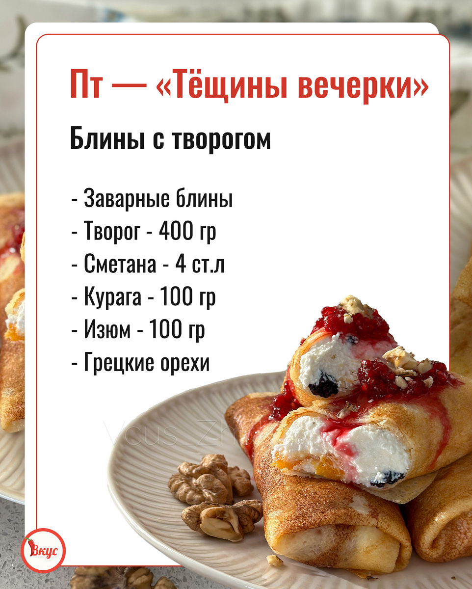 По доброй масленичной традиции в пятницу зятья приходят в гости к тёще на блины. А значит — пора готовить что-то особенное, сытное и душевное. Предлагаем начинку, которая нравится всем без исключения: нежный творог, сладкая курага, ароматный изюм и хрустящие орешки сверху. - Заварные блины или блины по классическому рецепту - Творог - 400 гр - Сметана - 4 ст.л - Курага - 100 гр - Изюм - 100 гр - Грецкие орехи и варенье для украшения 1. Печём блины. Замесите тесто, дайте ему отдохнуть 20–30 минут и пожарьте стопку румяных блинов. 2. Готовим начинку. Творог разомните вилкой или пробейте блендером, смешайте со сметаной. Добавьте мелко нарезанную курагу и изюм — перемешайте до однородности. 3. Заворачиваем. Выложите начинку на край блина и сверните плотным конвертиком. 4. Хрустящая корочка (по желанию). Обжарьте конвертики на сливочном масле до золотистого цвета — так будет ещё вкуснее! 5. Подаём. Выложите на тарелку, посыпьте измельчёнными грецкими орехами, рядом положите ложку ароматног