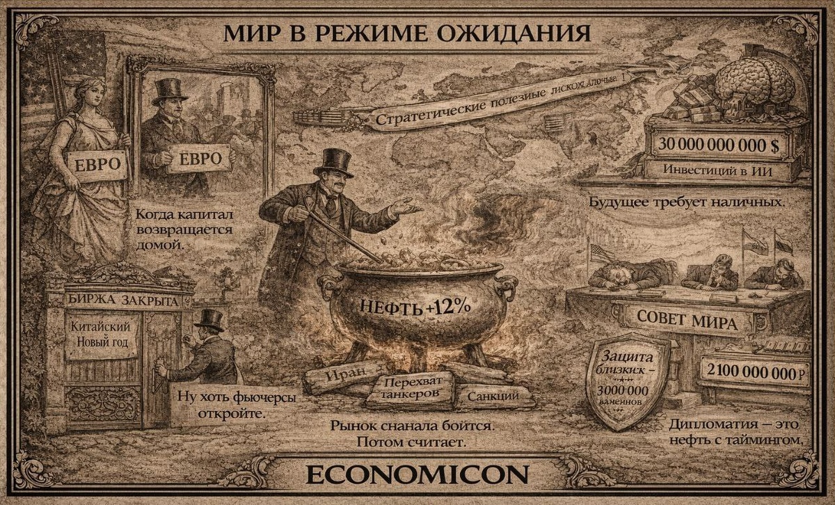! На связи утренний дайджест Economicon 😎 ☕️ Утро. Пятничка. Нефть за неделю +12%. Все ждут «если вдруг». Рынки, как всегда, заранее нервничают. 💱 Валюта и сырьё на сегодня: $ — ₽76,6405 € — ₽90,1669 ¥ — ₽11,0747 Gold — ~5010 Brent — ~72 🗓 Ключевые события ▪️ Fix Price — последний день торгов T+1 перед паузой из-за обратного сплита. ▪️ Китайский Новый год — биржи Китая закрыты. ▪️ Инвесторы рекордно вкладываются в европейские акции — FT. ▪️ Форум ВТБ «Россия зовёт!» стартует сегодня в Петербурге. ▪️ РСПП завершает Неделю российского бизнеса. 🌍 Геополитика ▪️ Трамп задремал на первом заседании «Совета мира». Символизм излишне очевиден. ▪️ Переговоры с Ираном — «ещё 10–15 дней». ▪️ США получили от Венесуэлы 50 млн баррелей нефти. ▪️ Новая Зеландия снизила потолок цен на нефть РФ до $47,6. ▪️ Еврокомиссия готовит основания для перехвата российских танкеров. 🛢 Энергия и сырьё ▪️ США и Узбекистан подписали соглашение по стратегическим полезным ископаемым. Мир переходит в режим «р