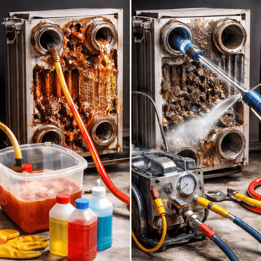 Теплообменник - ключевой элемент котла и системы отопления. Именно он отвечает за передачу тепла от горелки к теплоносителю. Со временем внутри теплообменника неизбежно накапливаются накипь, соли, продукты коррозии и шлам. Это снижает КПД оборудования, увеличивает расход газа или электроэнергии и может привести к серьезной поломке. Один из самых частых вопросов, который задают владельцы котлов: какую промывку выбрать - химическую или гидродинамическую? Разберемся подробно. Даже при использовании качественного теплоносителя внутри теплообменника со временем образуются отложения. Их последствия: Регулярная промывка позволяет продлить срок службы оборудования и избежать дорогостоящей замены. Химическая промывка - это очистка теплообменника с помощью специальных реагентов, которые растворяют: Раствор циркулирует внутри теплообменника с помощью промывочного насоса. Гидродинамическая промывка выполняется с помощью воды (иногда с воздухом) под высоким давлением. Отложения удаляются механическ