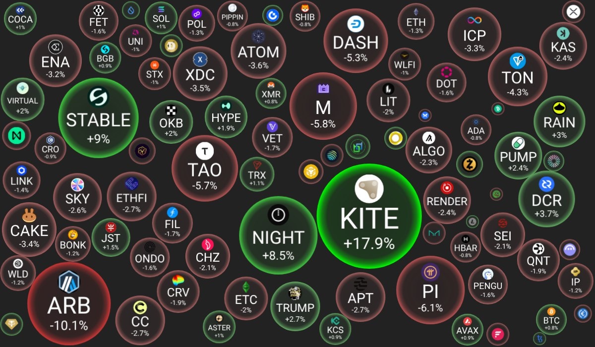 🗓 20.02.2026 09:30 по Москве. 🔗 Посмотреть на сайте 📈 Лидеры роста (из ТОП-100): 🟢 Kite (KITE): $0.2691 (+17.9%) 🟢 Stable (STABLE): $0.0297 (+9%) 🟢 Midnight (NIGHT): $0.0631 (+8.5%) 📉 Лидеры падения (из ТОП-100): 🔴 Arbitrum (ARB): $0.0964 (-10.1%) 🔴 Pi Network (PI): $0.1766 (-6.1%) 🔴 MemeCore (M): $1.3160 (-5.8%) 🔍 Основные метрики: 🟢 Общая капитализация: $2318.52 млрд (+0.34%) 🔴 Общий объем торгов: $80.08 млрд (-2.96%) 🟢 Доминация Bitcoin: 58.40% (+0.29%) 🔴 Доминация Ethereum: 10.17% (-0.17%) 🔴 Индекс страха и жадности: 7 / 100: ЭКСТРЕМАЛЬНЫЙ СТРАХ (-2) 🟢 Индекс Альтсезона: 33 / 100: НЕ АЛЬТКОИН-СЕЗОН (+1) 📖 Интересно почитать: 👉 Подборка сервисов для полного технического анализа на рынке криптовалют в 2025 году. 😻 Наши сервисы и бонусы: 🫧 Coinbubbles.ru - наглядная визуализация рынка криптовалют в виде пузырей 📈 Gate - 20% скидка на комиссии при торговле на споте и фьючерсах