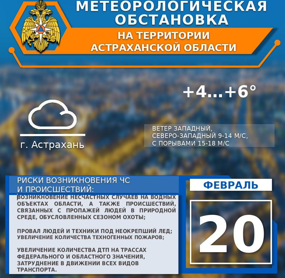 На территории области переменная облачность. Без существенных осадков.Ветер западный, северо-западный 9-14 м/с, с порывами 15-20 м/с. Температура воздуха по северной половине -2...+3°, по +3…+8°. На дорогах гололедица. По г. Астрахань: переменная облачность. Без существенных осадков.