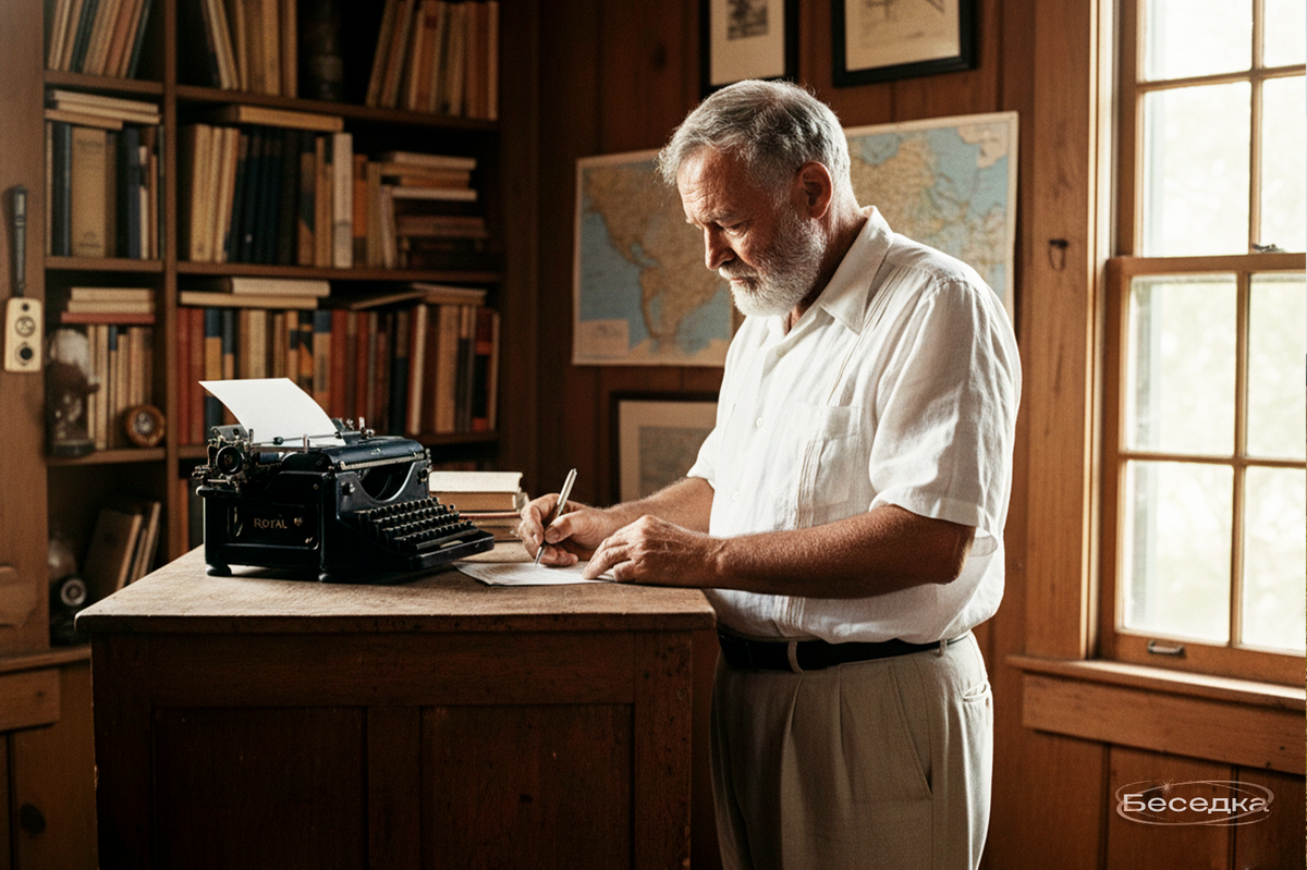 Даже если вы не читали произведения Хемингуэйя, благодаря социальным сетям, вы наверняка слышали про его самый короткий рассказ о детских ботиночках. Но знали ли вы, что сестра-краткость была его визитной карточкой на всём пути его творчества? Давайте разбираться, почему! Эрнест Хемингуэй просыпался на рассвете, подходил к высокому столу в спальне, ставил на него пишущую машинку и писал стоя. Несколько часов, пока мозг свеж и никто не мешает. Когда заканчивал, доставал карандаш и записывал в блокнот число: сколько слов написал сегодня. 500? 700? Иногда всего 200 — но они были правильными. Для Хемингуэя письмо было не вдохновенным полётом, а ежедневной работой со словом, как у ювелира с алмазом. Хемингуэй начинал карьеру журналистом — профессия, где каждое слово на счету, где нельзя лить воду и приукрашивать. Да, в то время в журналистике было именно так. Эта школа и определила его стиль навсегда: короткие предложения, минимум прилагательных, никакой психологической болтовни, действие в