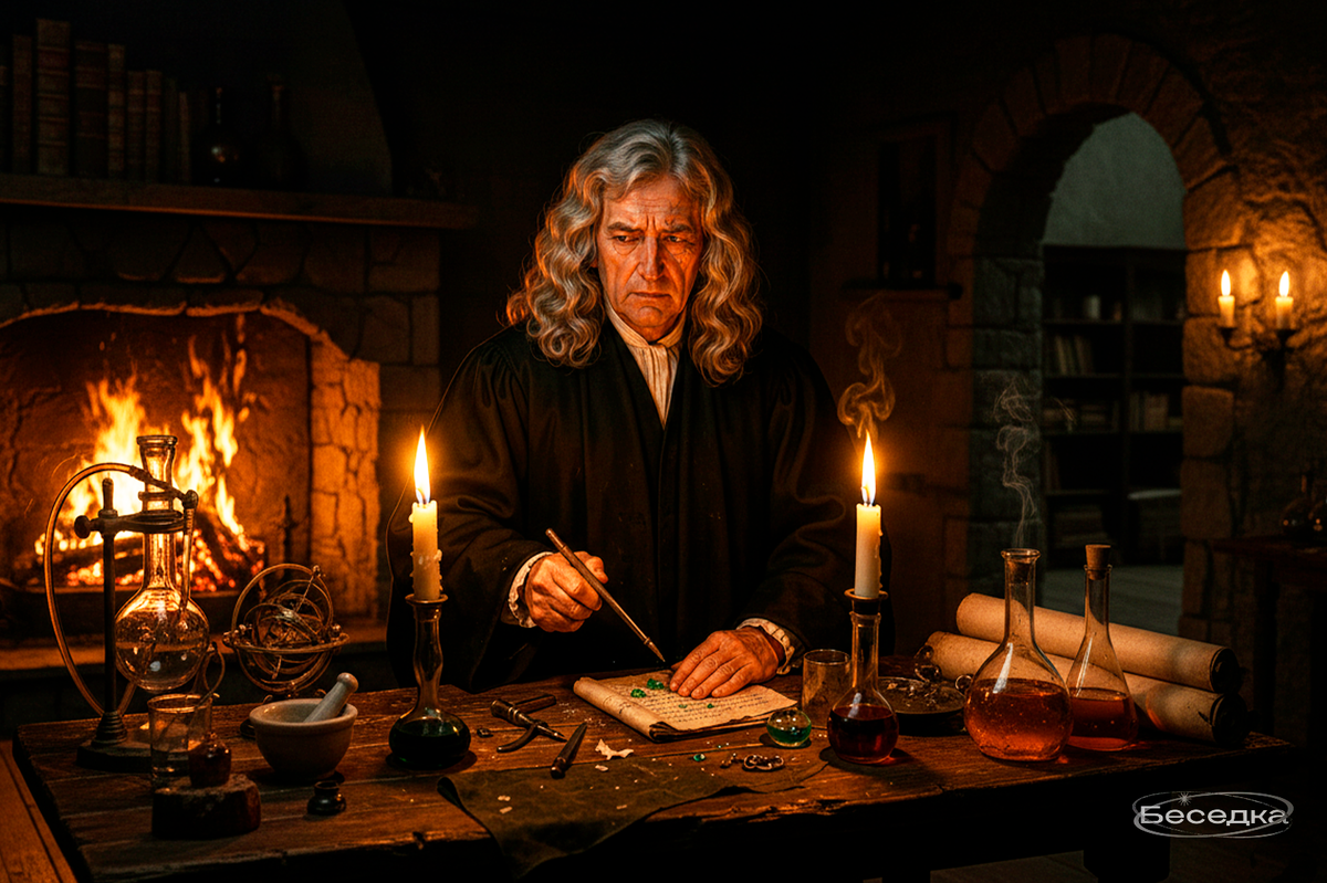 Ночью в Кембридже не слышно ничего, кроме редких шагов и ветра в узких улицах. В окне одной комнаты горит свет: там не спит человек, который потом станет символом «строгой науки». На столе не только расчёты и диаграммы, но и странные записи, в которых мелькают загадочные термины, намёки, шифры. Пахнет не чернилами, а чем-то резким, химическим. И если бы вы заглянули внутрь, то увидели бы следующую картину: Исаак Ньютон, тот самый Ньютон, занимается алхимией. Кто-то скажет, что это похоже на выдумку, но есть весомый аргумент – Ньютон оставил большой массив текстов об алхимии, и историки прямо называют алхимию центральной частью его «оккультных исследований». Более того, в его бумагах встречается интерес к философскому камню и идее превращения металлов в золото — тому, что мы привыкли считать символом алхимического мифа. В XVII веке различия между тем, что мы сегодня называем наукой, суеверием и псевдонаукой, ещё только формировались. Химия была «в младенчестве», и даже серьёзные экспери