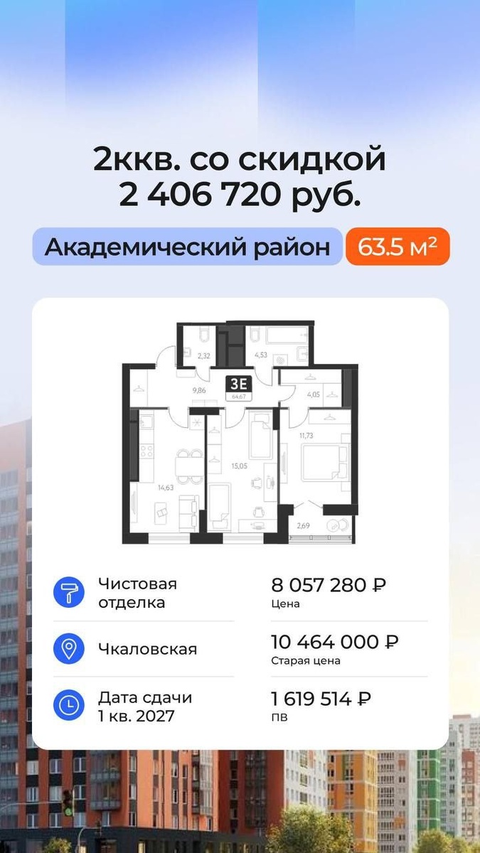 ! ΠΡΠΈΠΌΠ΅ΡΡ ΡΠ°ΡΡΠ΅ΡΠΎΠ² ΠΏΠΎ ΡΡΠ°Π²ΠΊΠ΅ 7% Π½Π° 7 Π»Π΅Ρ Ρ ΡΡΠ΅ΡΠΎΠΌ ΡΠΊΠΈΠ΄ΠΊΠΈ: βͺοΈ1-ΠΊ ΠΊΠ²Π°ΡΡΠΈΡΠ° 41,83 ΠΊΠ ΠΌ Ρ Π»ΠΎΠ΄ΠΆΠΈΠ΅ΠΉ ΠΈ ΡΠΈΡΡΠΎΠ²ΠΎΠΉ ΠΎΡΠ΄Π΅Π»ΠΊΠΎΠΉ Π¦Π΅Π½Π° Π±Π΅Π· ΡΠΊΠΈΠ΄ΠΊΠΈ β 7 791 000 ΡΡΠ±. Π¦Π΅Π½Π° ΡΠΎ ΡΠΊΠΈΠ΄ΠΊΠΎΠΉ β 5 999 070 ΡΡΠ±. ΠΠ»Π°ΡΠ΅ΠΆ β 37 162 ΡΡΠ±. Π½Π° 7 Π»Π΅Ρ βͺοΈ2-ΠΊ ΠΊΠ²Π°ΡΡΠΈΡΠ° 63,5 ΠΊΠ² ΠΌ Ρ Π»ΠΎΠ΄ΠΆΠΈΠ΅ΠΉ ΠΈ ΡΠΈΡΡΠΎΠ²ΠΎΠΉ ΠΎΡΠ΄Π΅Π»ΠΊΠΎΠΉ Π¦Π΅Π½Π° Π±Π΅Π· ΡΠΊΠΈΠ΄ΠΊΠΈ β 10 464 000 ΡΡΠ±. Π¦Π΅Π½Π° ΡΠΎ ΡΠΊΠΈΠ΄ΠΊΠΎΠΉ β 8 057 280 ΡΡΠ±. ΠΠ»Π°ΡΠ΅ΠΆ β 49 911 ΡΡΠ±. Π½Π° 7 Π»Π΅Ρ