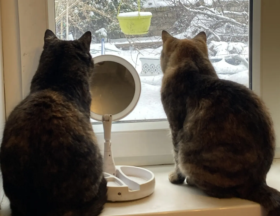 Кто тут хотел почаще видеть кошечек моих, а то всё Антоха да Антоха? Вот вам кошечки. Раздумывают, идти на улицу или ну его. Решили, что сегодня ну его. Там снега на стоячую ладонь насыпало, кошечкам моим прям по уши будет.