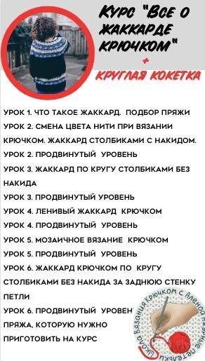 Иногда не хватает не навыка. Не таланта. А спокойной, понятной системы. Вы пробовали. Может быть, распускали. Может быть, узор «плыл». Может быть, казалось, что это слишком сложно. И в какой-то момент появляется мысль: «Наверное, это не для меня». Но жаккард — это не про «сложно». Это про понимание. И именно для этого я создала курс «Все о жаккарде крючком. Круглая кокетка». 🍓 Что в нём особенного Не просто уроки. А выстроенный путь: ▶️ от понимания, что такое жаккард ▶️ до уверенного создания круглой кокетки ▶️ от аккуратной смены цвета ▶️ до мозаичных и выразительных узоров Три направления, которые дополняют друг друга: 👩🦰 круглая кокетка 👨🦰 жаккард крючком 👱♂️ мозаичное вязание Вы начинаете видеть логику. Перестаёте вязать «на авось». И начинаете вязать осознанно. 😀Что вы получите: — понятные пошаговые уроки — практику, которая закрепляет результат — обратную связь — поддержку — доступ к материалам без ограничений по времени Можно идти в своём темпе. Можно перес