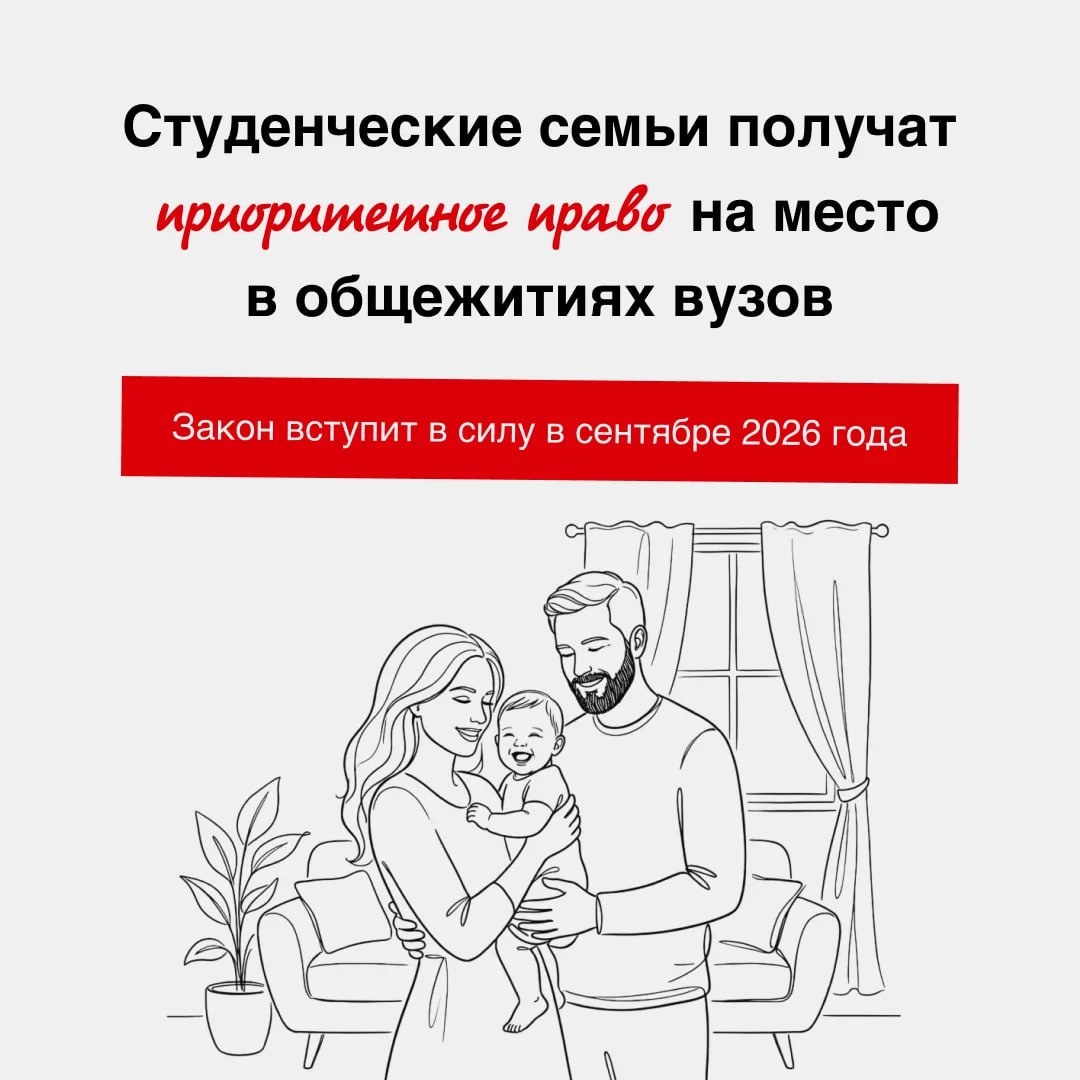 – Дәүләт Думаһы был хаҡта закон проектын ҡабул итте, ул 2026 йылдың сентябренән көсөнә инәсәк. “Берҙәм Рәсәй" студенттарҙың һорауын ишетте. Хәҙер уҡыу йорттары торлаҡ йорт фондынан йәш ғаиләләргә айырым бүлмәләр, ғаилә блоктары һәм фатирҙар беренсе сиратта бирергә тейеш. Тулыраҡ - карточкаларҙа һәм сайтта: https://vk.cc/cUzafl