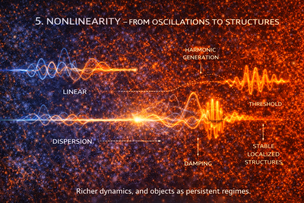 И самое важное: без нелинейности носитель остаётся слишком бедным, чтобы из него вырос мир с объектами, порогами, устойчивыми формами и “режимами” как отдельными сущностями.