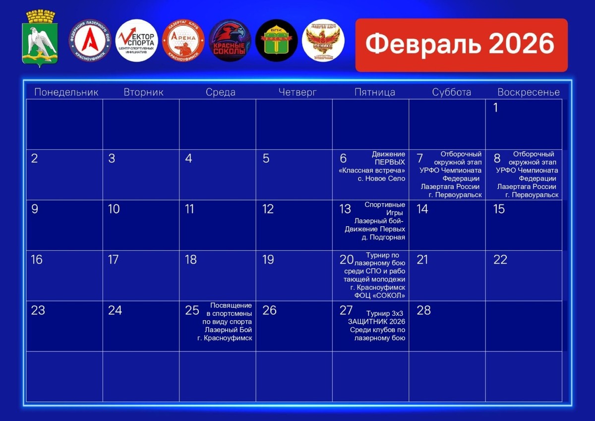 Публикуем программу мероприятий на ближайшие дни. Внимание, она может меняться и дополняться. Анонс мероприятий по лазерному бою на февраль 16-20 февраля, 10.30 — специальная игровая программа для детских садов «Масленичные забавы» (городской парк, 0+). 18-22 февраля — масленичные программы (краеведческий музей, 0+, запись по телефонам: 5-11-31, 7-62-10). 20 февраля 12.00 — игра «Лазерный шторм» (ФОЦ «Сокол», 6+, положение здесь); 15.00 — концерт «Отчизны верные сыны» (ЦКиД, 6+). 20-25 февраля — дружеский турнир по Dota 2 (МЦ «Космос», 12+, положение здесь). 21 февраля 9.30 — 2 этап турнира «Шахматный марафон в Красноуфимске» (школа №9 на ул. Р. Горбуновой, 6+, положение здесь); 10.00 — турнир по подледному лову рыбы (Рахмангулово, 6+); 12.00 — ярмарка авторских изделий от местных мастеров (краеведческий музей, 6+); 14.00 — православная Масленица (Боголюбский монастырь, 6+); 15.00 — мастер-класс «Если хочешь быть здоров — пой!» (ДШИ им. П.И. Осокина, 6+); 18.00 — развлекательное шоу- д