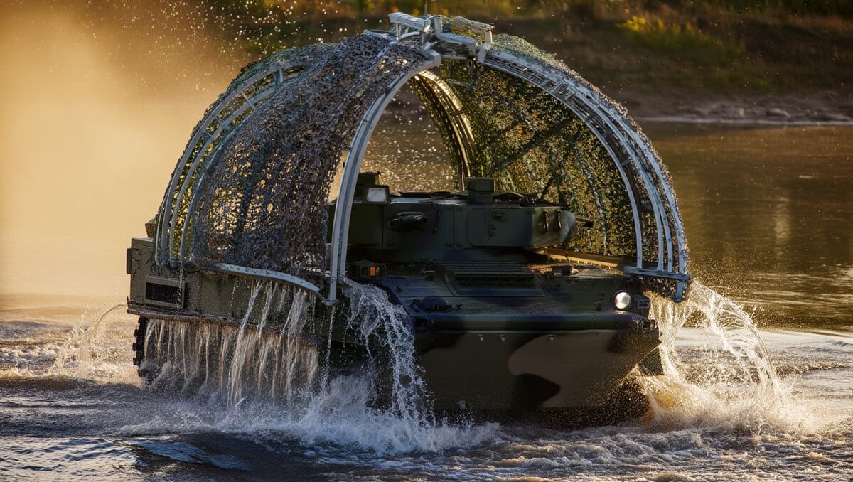 В России придумали новую защиту для боевых плавающих машин в виде раздвижной маски. Разработка предназначена для сокрытия техники при преодолении водных преград и одновременной защиты верхней проекции от атак дронов. Конструкция представляет собой каркас из полусферических дуг, закреплённых на борту машины шарнирным механизмом. В рабочем положении дуги образуют над корпусом купол, на который натягивается маскировочное покрытие, подобранное под цвет водной поверхности. Такая схема деформирует очертания техники и снижает её визуальную заметность при наблюдении с воздуха. Одновременно купольная маска создаёт дополнительный барьер для FPV-дронов и кумулятивных боеприпасов, заставляя их срабатывать на расстоянии от брони. Маска складывается в транспортное положение и монтируется силами экипажа. Решение повышает живучесть плавающей техники без серьёзного изменения конструкции машины.