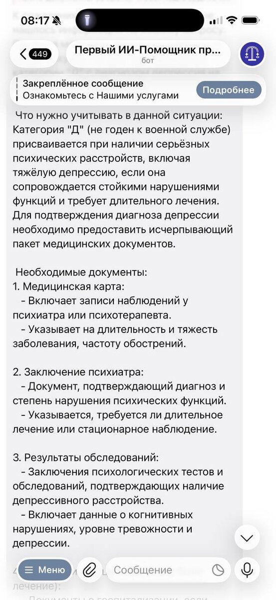 карту у ИИ-Помощника Вопрос: какие документы собрать, чтобы подтвердить категорию «Д» с депрессией? Ответ прикрепляю ⬆️