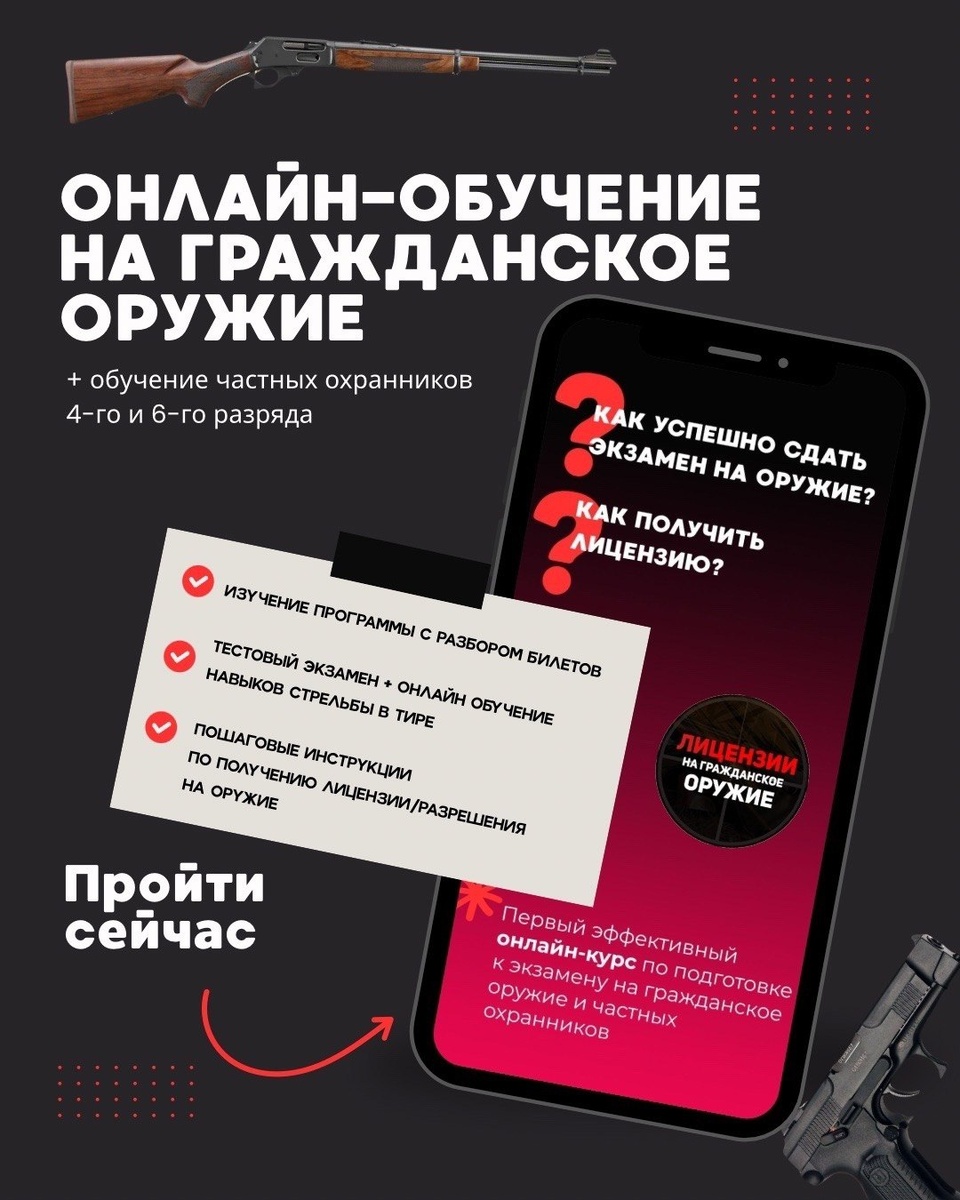 ? Пройдите наш онлайн-курс подготовки: ✔️ Вся теория и билеты в удобном формате ✔️ Правовая и огневая подготовка ✔️ Пошаговая инструкция по документам 📲 Все материалы — онлайн, доступны в удобное время Более 2 970 человек уже получили лицензию с нашей помощью! 👉🏼 Начните подготовку прямо сейчас — kurs.license-weapon.ru/