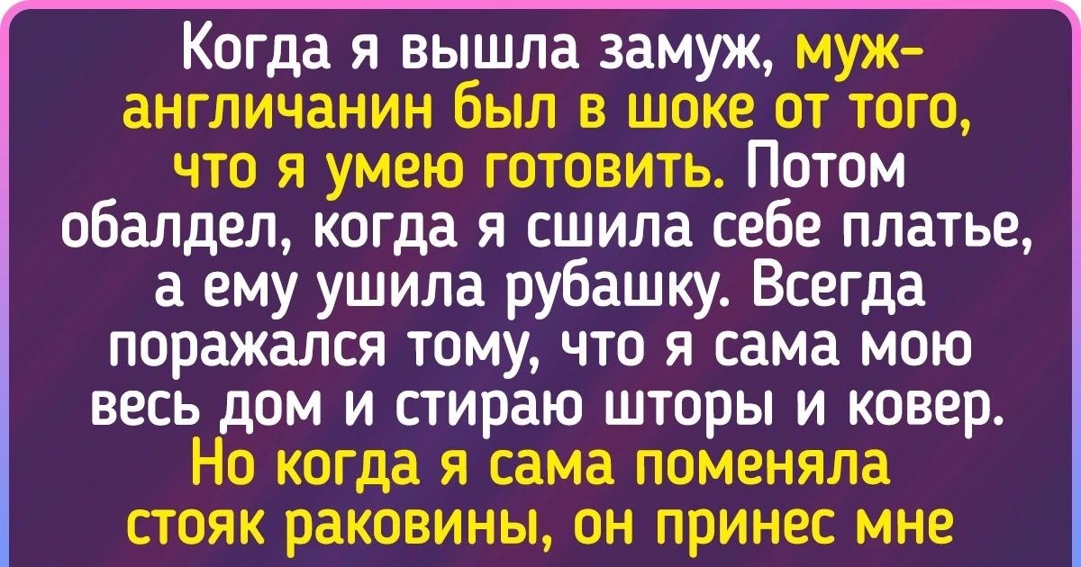 “Когда я вышла замуж, то муж-англичанин был в шоке от того, что я умею готовить. Потом обалдел, когда я сшила себе платье, а ему ушила рубашку. Стал смотреть на меня, как на ненормальную, когда я связала ему свитер и носки на зиму. Всегда поражался тому, что я сама мою весь дом и стираю шторы и ковер. Но когда я сама поменяла стояк в раковине, он принес мне нимб. Нимб! Да, мы, русские девушки, такие! И для нас нормально, когда девушка умеет быть хозяйственной.”