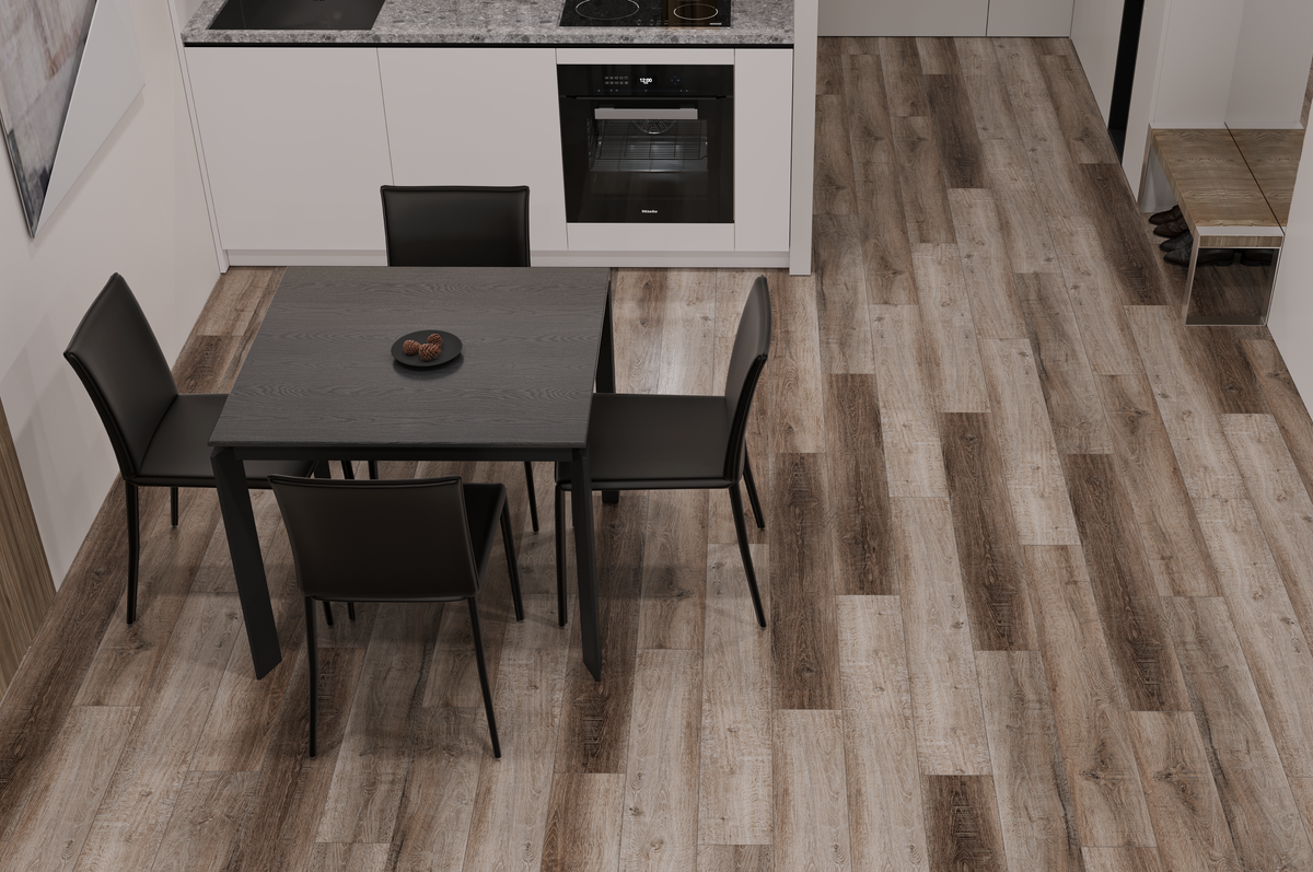Кухня — одно из самых «нагруженных» помещений в доме. Здесь проливается вода, падает посуда, двигаются стулья и постоянно меняется температура. Поэтому пол должен быть не просто красивым, а действительно практичным. Разбираемся, на что обратить внимание при выборе. Кухня = вода. Мытьё полов, случайные проливы, влажная уборка. Если материал боится влаги, со временем он может разбухнуть или деформироваться. Оптимально выбирать покрытие с высокой влагостойкостью, например SPC-ламинат на каменно-полимерной основе — он не боится ни воды, ни влаги и является полностью водостойким, а также сохраняет геометрию. На кухне высокая проходимость. Плюс нагрузка от мебели и бытовой техники. Обратите внимание на: Слишком мягкие материалы быстро теряют внешний вид. Кухонный пол должен легко очищаться. Матовая фактура обычно практичнее глянца — на ней меньше заметны следы и разводы. Важно, чтобы покрытие выдерживало регулярную влажную уборку без потери качества. Если планируется система подогрева, заран