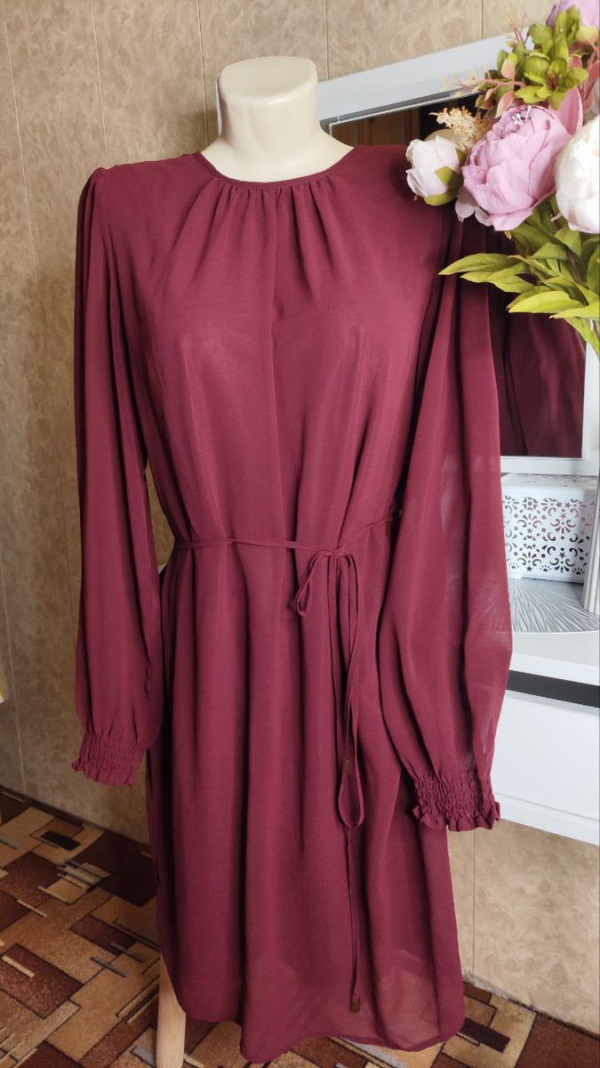 На талии тонкий пояс. Это платье придаст образу лёгкость и элегантность Бордовое платье из шифона, подклад из полиэстера размер 44 -46(S/M). Длина изделия составляет 95 см, ширина в груди —53 см, длина рукава — 63 см. Платье имеет пояс на талии и манжеты на рукавах. Платье с подкладкой. Состояние хорошее, есть небольшие затяжки, поэтому на платье идёт скидка! 🔥 Цена 500 рублей 300 рублей Без стоимости пересылки